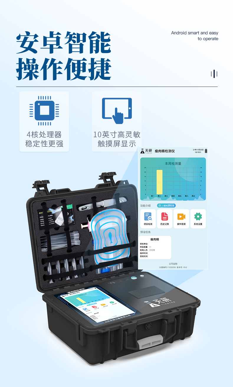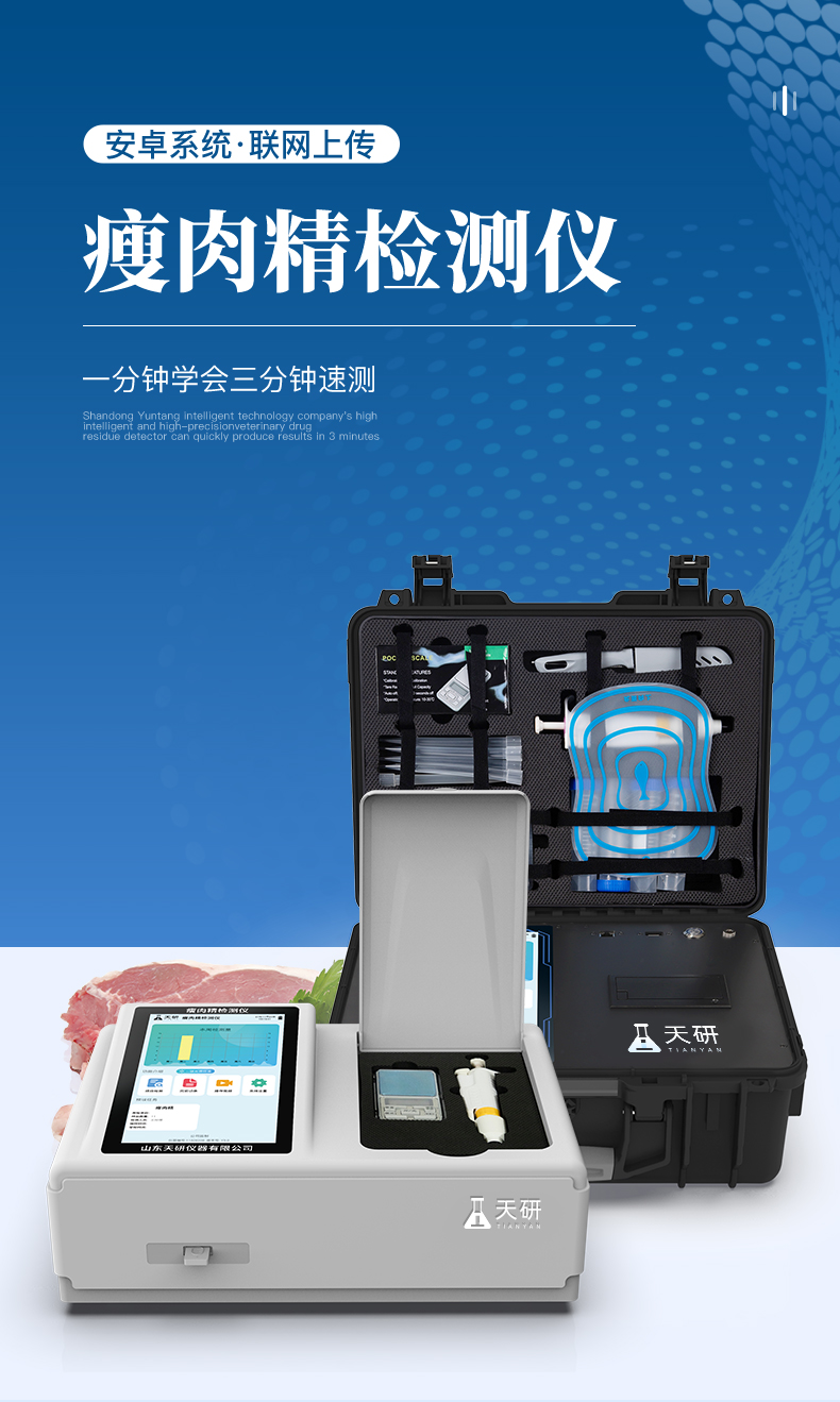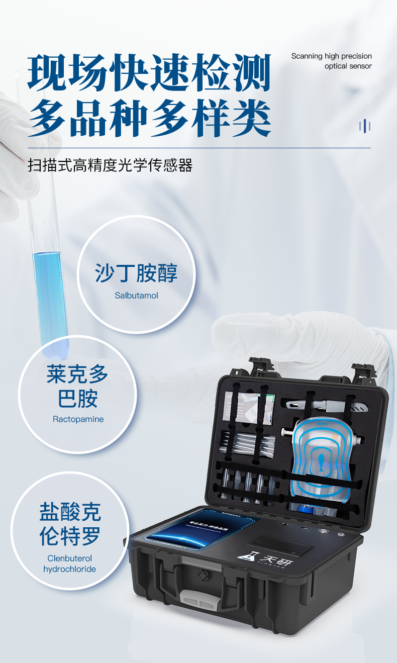 瘦肉精檢測儀可現場快速檢測鹽酸克倫特羅、萊克多巴胺、沙丁胺醇、己烯雌酚、喹乙醇等。儀器預留其他項目檢測程序和端口,根據日后需求可方便的自主增加檢測項目。日后可升級為檢測抗生素、獸藥殘留、動物疫病、病害肉、的綜合類型儀器