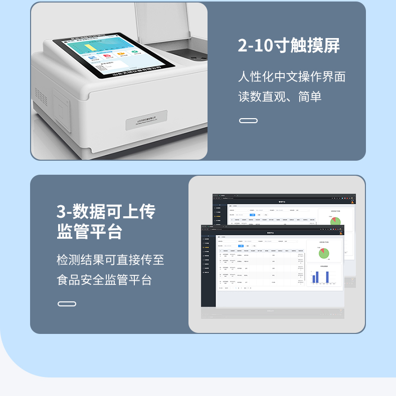 | 儀器采用臺式一體化系統(tǒng)檢測技術(shù),將分光光度模塊、新型農(nóng)殘檢測模塊、數(shù)字化管理模塊、無線通訊模塊高度集成于一體,支持檢測200種食品安全檢測項(xiàng)目,同時預(yù)留升級檢測方法。 | 儀器檢測模塊標(biāo)準(zhǔn)化、智能化,可隨意自由組合。檢測箱體內(nèi)置多個標(biāo)準(zhǔn)檢測單元,檢測模塊可以調(diào)整配置。 | 儀器采用全新安卓智能系統(tǒng),主控芯片采用 ARM Cortex-A7,RK3288/4核處理器,10.1寸高清液晶觸摸豎屏,更加**的UI交互界面,運(yùn)轉(zhuǎn)快捷;儀器配備無線通信模塊: 4G(APN)通訊模塊、Wifi模塊,藍(lán)牙傳輸,同時具有雙USB接口以及RJ45接口能以多種方式實(shí)現(xiàn)數(shù)據(jù)保存和數(shù)據(jù)傳輸功能。 | 創(chuàng)新檢測模式: | ★檢測通道:≥12通道;采用精密旋轉(zhuǎn)比色池設(shè)計,使用同芯片同光源校準(zhǔn)精度,解決不同光源之間的誤差值。1-12通道間誤差0.1%。(**號:ZL202022821055.2) | ★儀器具有自動識別比色皿檢測功能,即:將樣品比色皿放入儀器后,點(diǎn)擊樣品檢測,儀器自動識別比色皿進(jìn)行通道檢測。 | 進(jìn)口高精光源: | 高精度進(jìn)口四波長冷光源,通道配置 410、520、590、630nm 波長光源,一個光源芯片驅(qū)動一個光源,誤差極小,每臺設(shè)備單獨(dú)**校準(zhǔn)光源,**比對,同時參照四種不同波段光源全方位覆蓋市面上99%的農(nóng)殘食品項(xiàng)目檢測。 | 智能化操作系統(tǒng): | 便捷操作系統(tǒng):設(shè)備檢測時可在同一檢測界面自動對應(yīng)相關(guān)檢測通道一次性選擇1-12個樣品名稱,無須退出界面,節(jié)省操作時間。 | 數(shù)據(jù)集成系統(tǒng):設(shè)備首頁自動統(tǒng)計檢測數(shù)據(jù)包含:周檢測數(shù)據(jù)、月檢測數(shù)據(jù),全部檢測總數(shù)量,均包含檢測總數(shù),合格數(shù),不合格數(shù),以及相關(guān)柱形分析圖,對各項(xiàng)檢測數(shù)據(jù)清晰掌握,無需電腦查詢,更加快捷直觀。 | 項(xiàng)目預(yù)設(shè)系統(tǒng):支持添加單個及多個相同或不相同的任務(wù)預(yù)設(shè),一鍵快速調(diào)取,每一個任務(wù)分別可以設(shè)置不同的樣品、批次、編號、來源、備注、抽樣信息、檢測信息、受檢信息、復(fù)核信息等更多信息。無縫鏈接平臺和APP實(shí)時查看下發(fā)任務(wù)。 | 數(shù)據(jù)監(jiān)管系統(tǒng):同步對接監(jiān)管平臺,數(shù)據(jù)可局域網(wǎng)和互聯(lián)網(wǎng)數(shù)據(jù)上傳,檢測結(jié)果可選擇直接傳至食品安全監(jiān)管平臺。集成OSS輸出存儲服務(wù)、區(qū)分設(shè)備定向管理應(yīng)用,進(jìn)行區(qū)域食品安全監(jiān)管及大數(shù)據(jù)分析處理與數(shù)據(jù)統(tǒng)計,檢測區(qū)域食品安全長短期動態(tài),達(dá)到食品安全問題預(yù)估、預(yù)警。 | 自定義打印系統(tǒng):內(nèi)置全新打印系統(tǒng),新創(chuàng)自定義打印方式,可按需靈活設(shè)置開啟或關(guān)閉:產(chǎn)品合格證(國家農(nóng)業(yè)部標(biāo)準(zhǔn)要求),二維碼,抽樣信息、檢測信息,受檢信息、復(fù)核信息、抽樣日期、檢測日期等信息的打印。 | 系統(tǒng)遠(yuǎn)程更新功能:可定向分客戶分儀器更新系統(tǒng),按照不同客戶后期實(shí)際需求添加項(xiàng)目,無需機(jī)器返廠,即可遠(yuǎn)程實(shí)時升級全新系統(tǒng),節(jié)省時間成本及避免運(yùn)輸造成設(shè)備損壞。 | 儀器主機(jī)采用一體化防水、抗壓、防撞擊、防腐蝕箱體設(shè)計,同時配備交直流供電,可連接車載電源,可選配大容量充電鋰電池,滿足現(xiàn)場野外檢測需求。 | 安全證書,放心保障:儀器具有中國計量科學(xué)研究院校準(zhǔn)證書,**認(rèn)證。 |