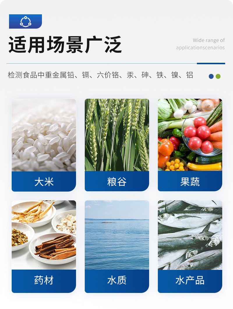 該食品重金屬檢測儀為集成化食品安全快速檢測分析設備,目前已于市場監管局、糧食加工企業、學校食堂、超市、配送中心、衛生部門、檢驗檢疫部門等單位廣泛使用。