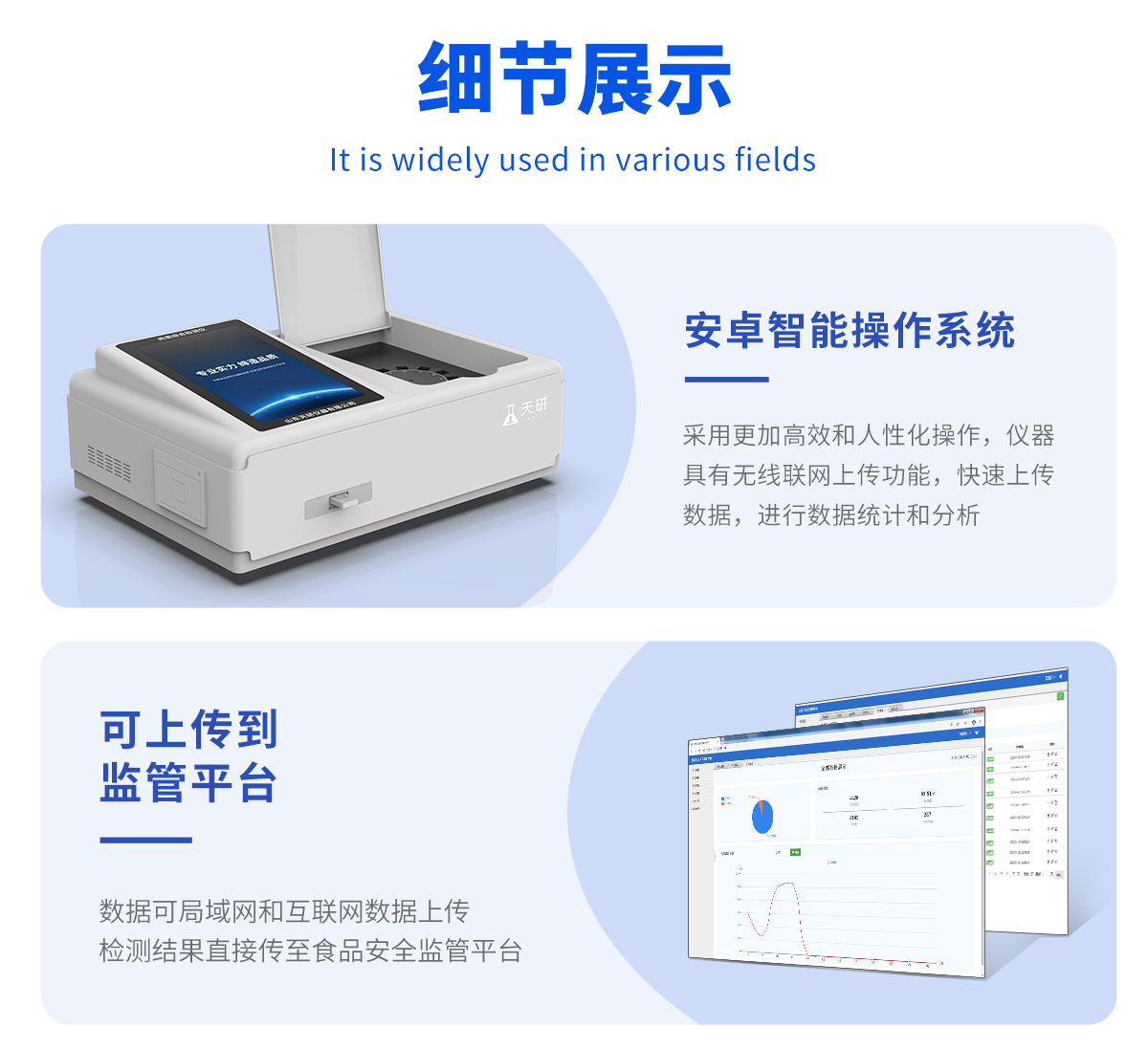 | 儀器采用臺(tái)式一體化系統(tǒng)檢測(cè)技術(shù),將分光光度模塊、膠體金檢測(cè)模塊、新型農(nóng)殘檢測(cè)模塊、數(shù)字化管理模塊、無(wú)線(xiàn)通訊模塊高度集成于一體,支持檢測(cè)200種食品安全檢測(cè)項(xiàng)目,同時(shí)預(yù)留升級(jí)檢測(cè)方法。 | 儀器檢測(cè)模塊標(biāo)準(zhǔn)化、智能化,可隨意自由組合。檢測(cè)箱體內(nèi)置多個(gè)標(biāo)準(zhǔn)檢測(cè)單元,檢測(cè)模塊可以調(diào)整配置。 | 儀器采用全新安卓智能系統(tǒng),主控芯片采用 ARM Cortex-A7,RK3288/4核處理器,10.1寸高清液晶觸摸豎屏,更加**的UI交互界面,運(yùn)轉(zhuǎn)快捷;儀器配備無(wú)線(xiàn)通信模塊: 4G(APN)通訊模塊、Wifi模塊,藍(lán)牙傳輸,同時(shí)具有雙USB接口以及RJ45接口能以多種方式實(shí)現(xiàn)數(shù)據(jù)保存和數(shù)據(jù)傳輸功能。 | 創(chuàng)新檢測(cè)模式: | ★檢測(cè)通道:≥12通道;采用精密旋轉(zhuǎn)比色池設(shè)計(jì),使用同芯片同光源校準(zhǔn)精度,解決不同光源之間的誤差值。1-12通道間誤差0.1%。(**號(hào):ZL202022821055.2) | ★儀器具有自動(dòng)識(shí)別比色皿檢測(cè)功能,即:將樣品比色皿放入儀器后,點(diǎn)擊樣品檢測(cè),儀器自動(dòng)識(shí)別比色皿進(jìn)行通道檢測(cè)。 | 進(jìn)口高精光源: | 高精度進(jìn)口四波長(zhǎng)冷光源,通道配置 410、520、590、630nm 波長(zhǎng)光源,一個(gè)光源芯片驅(qū)動(dòng)一個(gè)光源,誤差極小,每臺(tái)設(shè)備單獨(dú)**校準(zhǔn)光源,**比對(duì),同時(shí)參照四種不同波段光源全方位覆蓋市面上99%的農(nóng)殘食品項(xiàng)目檢測(cè)。 | 膠體金模塊檢測(cè)方式: | 采用COMS實(shí)時(shí)成像技術(shù),可采集多個(gè)畫(huà)面,支持3個(gè)金標(biāo)同時(shí)讀卡,通過(guò)不同顏色的灰度變化,一秒精準(zhǔn)得出結(jié)果。 | 智能化操作系統(tǒng): | 便捷操作系統(tǒng):設(shè)備檢測(cè)時(shí)可在同一檢測(cè)界面自動(dòng)對(duì)應(yīng)相關(guān)檢測(cè)通道一次性選擇1-12個(gè)樣品名稱(chēng),無(wú)須退出界面,節(jié)省操作時(shí)間。 | 數(shù)據(jù)集成系統(tǒng):設(shè)備首頁(yè)自動(dòng)統(tǒng)計(jì)檢測(cè)數(shù)據(jù)包含:周檢測(cè)數(shù)據(jù)、月檢測(cè)數(shù)據(jù),全部檢測(cè)總數(shù)量,均包含檢測(cè)總數(shù),合格數(shù),不合格數(shù),以及相關(guān)柱形分析圖,對(duì)各項(xiàng)檢測(cè)數(shù)據(jù)清晰掌握,無(wú)需電腦查詢(xún),更加快捷直觀。 | 項(xiàng)目預(yù)設(shè)系統(tǒng):支持添加單個(gè)及多個(gè)相同或不相同的任務(wù)預(yù)設(shè),一鍵快速調(diào)取,每一個(gè)任務(wù)分別可以設(shè)置不同的樣品、批次、編號(hào)、來(lái)源、備注、抽樣信息、檢測(cè)信息、受檢信息、復(fù)核信息等更多信息。無(wú)縫鏈接平臺(tái)和APP實(shí)時(shí)查看下發(fā)任務(wù)。 | 數(shù)據(jù)監(jiān)管系統(tǒng):同步對(duì)接監(jiān)管平臺(tái),數(shù)據(jù)可局域網(wǎng)和互聯(lián)網(wǎng)數(shù)據(jù)上傳,檢測(cè)結(jié)果可選擇直接傳至食品安全監(jiān)管平臺(tái)。集成OSS輸出存儲(chǔ)服務(wù)、區(qū)分設(shè)備定向管理應(yīng)用,進(jìn)行區(qū)域食品安全監(jiān)管及大數(shù)據(jù)分析處理與數(shù)據(jù)統(tǒng)計(jì),檢測(cè)區(qū)域食品安全長(zhǎng)短期動(dòng)態(tài),達(dá)到食品安全問(wèn)題預(yù)估、預(yù)警。 | 自定義打印系統(tǒng):內(nèi)置全新打印系統(tǒng),新創(chuàng)自定義打印方式,可按需靈活設(shè)置開(kāi)啟或關(guān)閉:產(chǎn)品合格證(國(guó)家農(nóng)業(yè)部標(biāo)準(zhǔn)要求),二維碼,抽樣信息、檢測(cè)信息,受檢信息、復(fù)核信息、抽樣日期、檢測(cè)日期等信息的打印。 | 系統(tǒng)遠(yuǎn)程更新功能:可定向分客戶(hù)分儀器更新系統(tǒng),按照不同客戶(hù)后期實(shí)際需求添加項(xiàng)目,無(wú)需機(jī)器返廠,即可遠(yuǎn)程實(shí)時(shí)升級(jí)全新系統(tǒng),節(jié)省時(shí)間成本及避免運(yùn)輸造成設(shè)備損壞。 | 儀器主機(jī)采用一體化防水、抗壓、防撞擊、防腐蝕箱體設(shè)計(jì),同時(shí)配備交直流供電,可連接車(chē)載電源,可選配大容量充電鋰電池,滿(mǎn)足現(xiàn)場(chǎng)野外檢測(cè)需求。 | 安全證書(shū),放心保障:儀器具有中國(guó)計(jì)量科學(xué)研究院校準(zhǔn)證書(shū),**認(rèn)證。 |