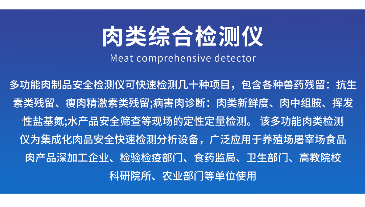 該肉類(lèi)綜合檢測(cè)儀為集成化肉品安全快速檢測(cè)分析設(shè)備,廣泛應(yīng)用于養(yǎng)殖場(chǎng)、屠宰場(chǎng)、食品肉產(chǎn)品深加工企業(yè)、檢驗(yàn)檢疫部門(mén)、食藥監(jiān)局、衛(wèi)生部門(mén)、高教院校、科研院所、農(nóng)業(yè)部門(mén)等單位使用。