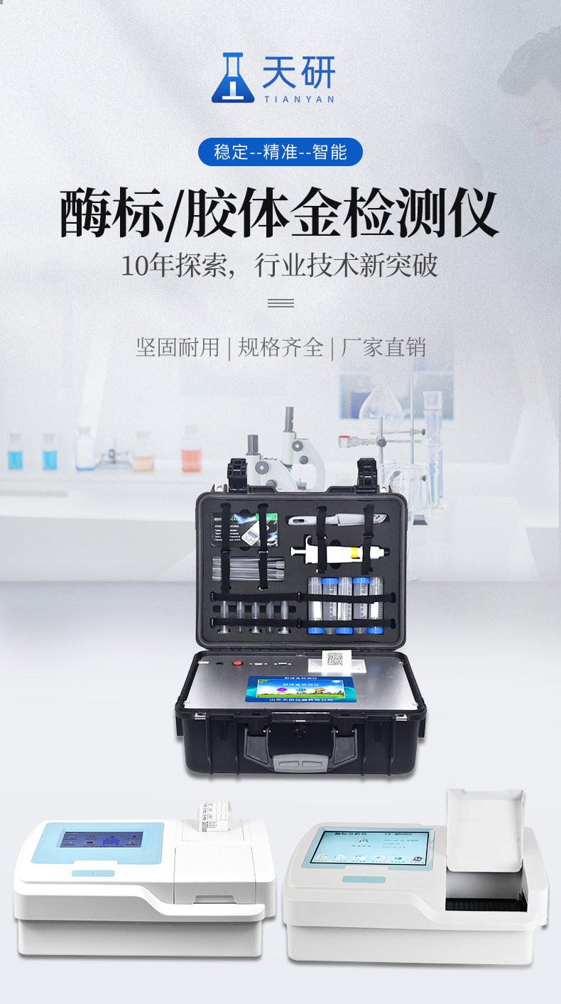 | 安卓智能操作系統,采用更加**UI交互界面,儀器具有wifi聯網上傳、4G聯網傳輸、GPRS無線遠傳、網線連接功能,快速批量上傳數據。 | 智能化程度高,儀器具有自檢功能:具有開機自檢和調零功能,具有自動檢測重復性功能。 | 新一代高速熱敏打印機,檢測完成可自動打印檢測報告和二維碼。 | 儀器帶有監管平臺,數據可局域網和互聯網數據上傳,檢測結果直接傳至食品安全監管平臺。進行區域食品安全監管及大數據分析處理與數據統計,檢測區域食品安全長短期動態,達到食品安全問題預估、預警 | 一體化便攜式快檢設備,滿足現場及流動檢測使用需求,能夠在同一軟件下實現所有檢測項目的檢測,并可通過同一窗口直觀顯示檢測結果。 | 膠體金模塊檢測方式:軌道式自動傳輸掃描,檢測完成后自動退出檢測卡。 | 一體化主機,包含食品安全檢測模塊、多通道農藥殘留檢測模塊、膠體金免疫層析檢測模塊。 | CT線自動識別,無需手動調整。 | 儀器具有品類多種類樣品菜單庫,可靈活選擇檢測樣品,不同的檢測通道可同時檢測不同的樣品項目。。 | 樣品處理簡單省力,整體操作快速、安全、便捷。 | 儀器具有自身保護功能,可設置用戶名及密碼,防止非工作人員操作等。 | 高靈敏度,高檢測精度,高重復性精度,掃描式高精度光學傳感器。 | 儀器具有重新校準、鎖定、恢復出廠設置功能。 | 內置強大的數據庫,可在儀器上直接選擇樣品名稱、檢測指標、送檢單位等信息,也可在儀器上直接編輯錄入樣品名稱、檢測指標、送檢單位等信息并保存進樣品數據庫。 | 儀器具有重新校準、鎖定、恢復出廠設置功能。 | 結果判定線可修改,對照值標定值可保存,斷電不丟失數據。 | 兼容市場上所有的膠體金卡,使用耗材不受限制,極大增強用戶使用體驗。 |