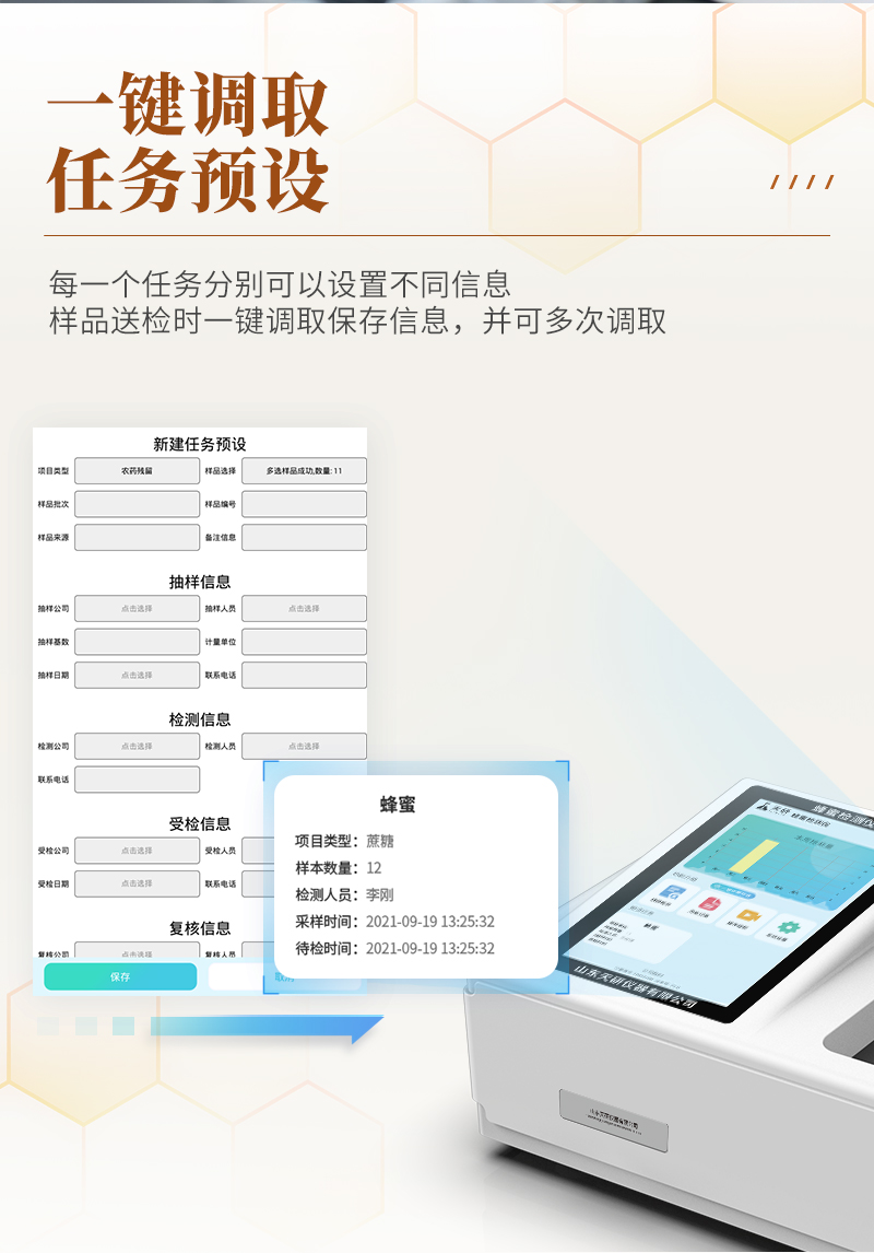 山東天研儀器有限公司生產的高智能蜂蜜檢測儀為集成化食品安全快速檢測分析設備,采用臺式一體化設計,可快速檢測200多種食品安全項目,包含非食用化學物質、濫用食品添加劑、農藥殘留、獸藥殘留、重金屬、病害肉、營養強化劑、抗生素類殘留、激素類殘留、真菌毒素類殘留、化學類殘留等項目的定性定量檢測。該高智能食品安全檢測儀為集成化食品安全快速檢測分析設備,目前已于食藥監局、衛生部門、高教院校、科研院所、農業部門、養殖場、屠宰場、食品肉產品深加工企業及檢驗檢疫部門等單位廣泛使用。