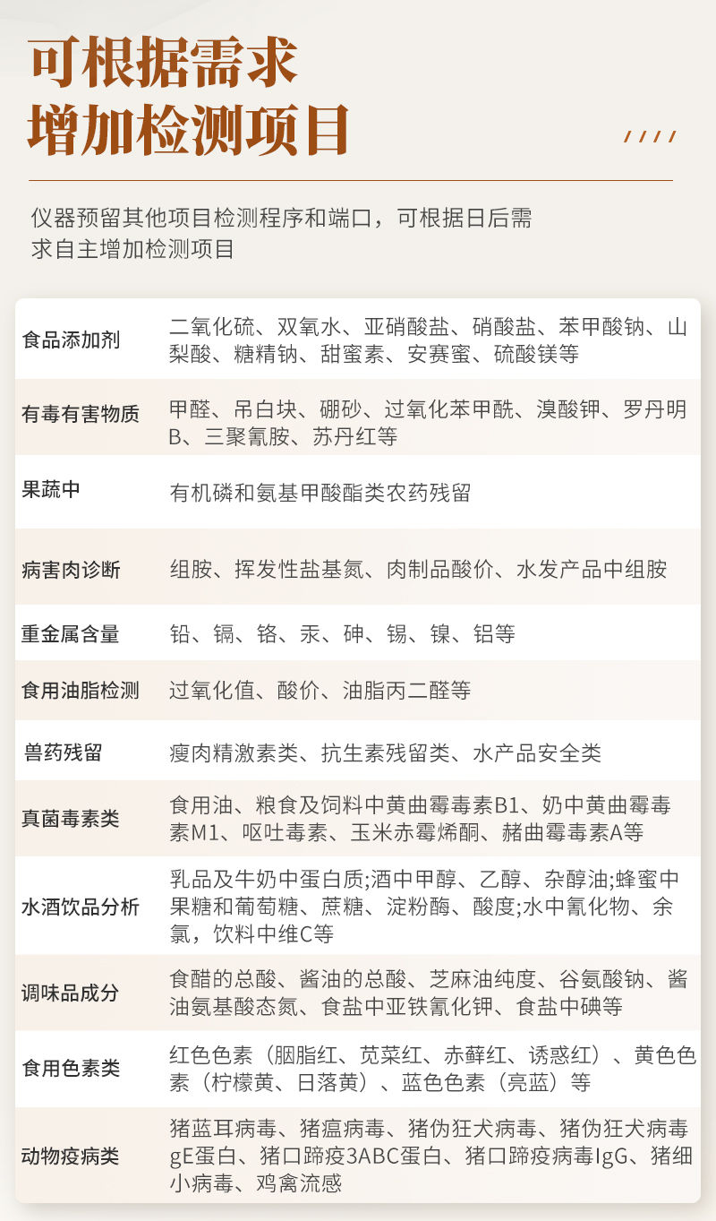 | 食品添加劑:二氧化硫、雙氧水、亞硝酸鹽、硝酸鹽、苯甲酸鈉、山梨酸鉀、糖精鈉、甜蜜素、木耳硫酸鎂等 | 有毒有害物質:甲醛、吊白塊、硼砂、過氧化苯甲酰、溴酸鉀、羅丹明B、三聚氰胺、蘇丹紅、工業堿、尿素、明礬等 | 果蔬:農藥殘留(酶抑制率法) | 病害肉診斷:組胺、揮發性鹽基氮; | 重金屬含量:鉛、鎘、鉻、汞、砷、錫、鎳、鋁等; | 食用油脂: 過氧化值、酸價等 | 瘦肉精激素類(獸藥):鹽酸克倫特羅、沙丁胺醇、萊克多巴胺、己烯雌酚等 | 抗生素殘留類(獸藥):四環素類、硝基呋喃類、磺胺類、β-興奮劑類、沙星類、磺胺類、喹諾酮類,甲砜霉素,氟苯尼考,金剛烷胺、替米考星、慶大霉素、林可霉素、鏈霉素、恩諾沙星、環丙沙星、頭孢啦啶、青霉素、阿莫西林等 | 真菌毒素類:食用油、糧食及飼料中黃曲霉毒素B1、黃曲霉毒素總量,奶中黃曲霉毒素M1、嘔吐毒素、玉米赤霉烯酮、赭曲霉毒素A、T2毒素、伏馬毒素等; | 水酒飲品分析:酒中甲醇、乙醇、乳品及牛奶中蛋白質, | 調味品成分:食醋的總酸、醬油的總酸、芝麻油純度、谷氨酸鈉、醬油氨基酸態氮、食鹽中亞鐵氰化鉀、食鹽中碘等 | 食用色素類:紅色色素(胭脂紅、莧菜紅、赤蘚紅、誘惑紅)、黃色色素(檸檬黃、日落黃)、藍色色素(亮藍)等 | 動物疫病類:禽流感、新城疫、牛羊口蹄疫、牛羊結核病、牛羊包蟲、牛羊布病、小反芻獸、豬藍耳病毒、豬瘟病毒、豬偽狂犬病毒、豬細小、豬圓環、犬細小病毒、犬瘟熱病毒、犬狂犬病毒等; | 蜂蜜成分:果糖和葡萄糖、蔗糖、淀粉酶、酸度等 | 水產品安全類:孔雀石綠、氯霉素、呋喃妥因、呋喃西林、呋喃它酮、呋喃唑酮等 | 蛋類藥物殘留:氯霉素,四環素,磺胺類,喹諾酮類,呋喃西林,呋喃它酮,呋喃妥因,呋喃唑酮,氟苯尼考,阿莫西林、頭孢氨芐、紅霉素、鏈霉素等 |