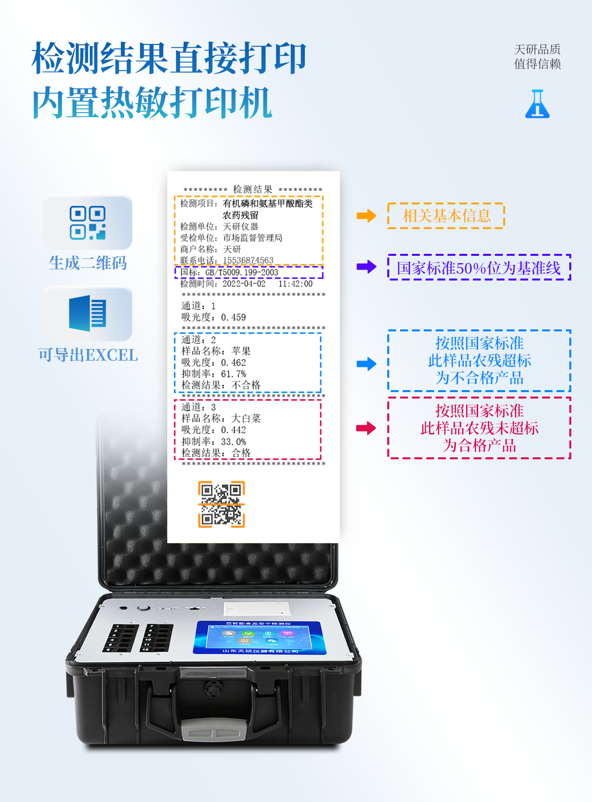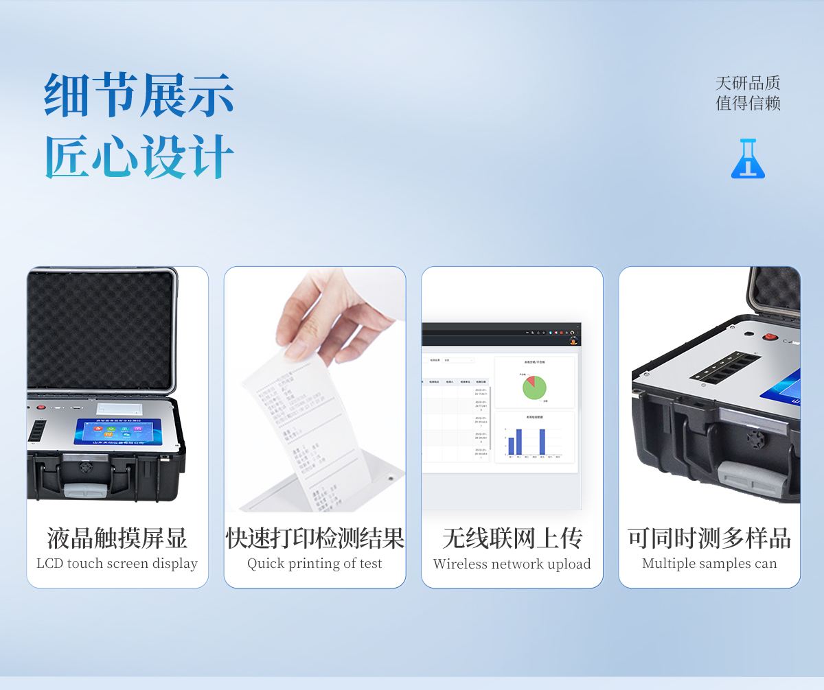 | 安卓智能操作系統,采用更加**的UI交互界面,儀器具有wifi聯網上傳、4G聯網傳輸、GPRS無線遠傳、網線連接功能,快速批量上傳數據。 | 智能化程度高,儀器具有自檢功能:具有開機自檢和調零功能,具有自動檢測重復性功能。 | 新一代高速熱敏打印機,檢測完成可自動打印或批量打印檢測報告和二維碼。 | 儀器帶有監管平臺,數據可局域網和互聯網數據上傳,檢測結果直接傳至食品安全監管平臺。進行區域食品安全監管及大數據分析處理與數據統計,檢測區域食品安全長短期動態,達到食品安全問題預估、預警 | 一體化主機,包含食品安全檢測模塊、多通道農藥殘留檢測模塊、膠體金免疫層析檢測模塊。 | 一體化便攜式快檢設備,滿足現場及流動檢測使用需求,能夠在同一軟件下實現所有檢測項目的檢測,并可通過同一窗口直觀顯示檢測結果。 | 膠體金模塊檢測方式:軌道式自動傳輸掃描,檢測完成后自動退出檢測卡。 | CT線自動識別,無需手動調整。 | 內置強大的數據庫,具有多品類多種類樣品菜單功能,可靈活選擇檢測樣品,不同的檢測通道可同時檢測不同的樣品項目。也可在儀器上直接編輯錄入樣品名稱、檢測指標、送檢單位等信息并保存進樣品數據庫。 | 產品內置操作演示視頻,是您身邊的化驗指導專家。 | 樣品處理簡單省力,整體操作快速、安全、便捷。 | 儀器具有自身保護功能,可設置用戶名及密碼,防止非工作人員操作等。 | 高靈敏度,高檢測精度,高重復性精度,掃描式高精度光學傳感器。 | 結果判定線可修改,對照值標定值可保存,斷電不丟失數據。 | 兼容市場上所有的膠體金卡,使用耗材不受限制,極大增強用戶使用體驗。 | 儀器具有重新校準、鎖定、恢復出廠設置功能。 |