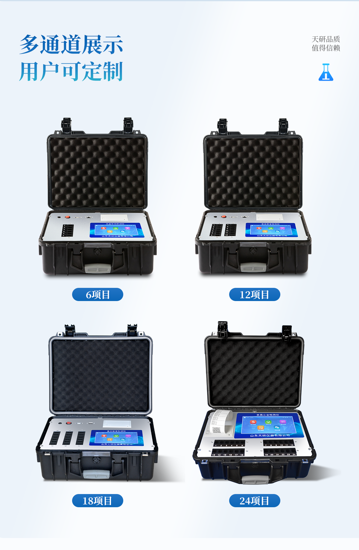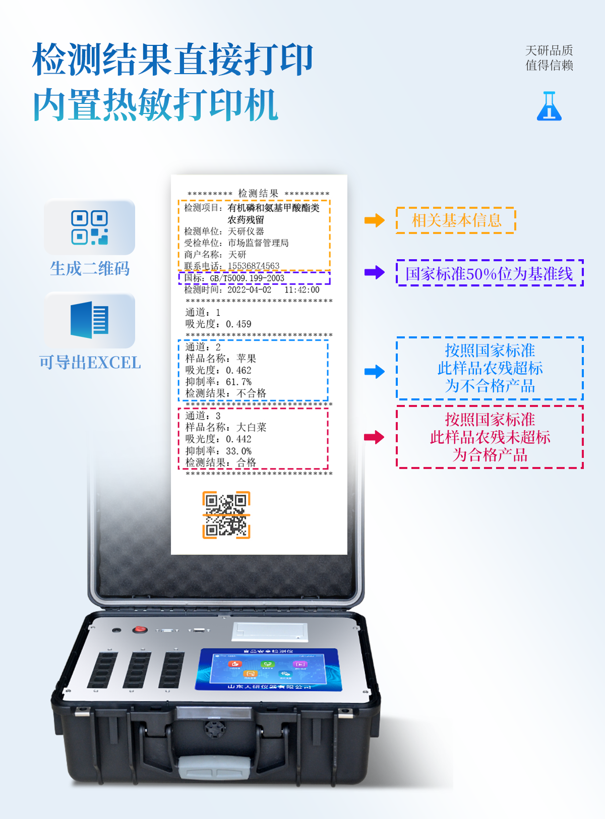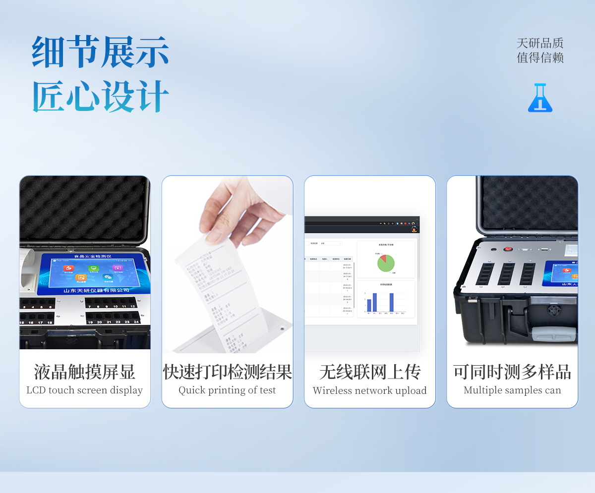 | 安卓智能操作系統,采用更加**的UI交互界面,儀器具有wifi聯網上傳、4G聯網傳輸、GPRS無線遠傳、網線連接功能,快速批量上傳數據。 | 智能化程度高,儀器具有自檢功能:具有開機自檢和調零功能,具有自動檢測重復性功能。 | 新一代高速熱敏打印機,檢測完成可自動打印或批量打印檢測報告和二維碼。 | 儀器帶有監管平臺,數據可局域網和互聯網數據上傳,檢測結果直接傳至食品安全監管平臺。進行區域食品安全監管及大數據分析處理與數據統計,檢測區域食品安全長短期動態,達到食品安全問題預估、預警 | 一體化主機,包含食品安全檢測模塊、多通道農藥殘留檢測模塊、膠體金免疫層析檢測模塊。 | 一體化便攜式快檢設備,滿足現場及流動檢測使用需求,能夠在同一軟件下實現所有檢測項目的檢測,并可通過同一窗口直觀顯示檢測結果。 | 膠體金模塊檢測方式:軌道式自動傳輸掃描,檢測完成后自動退出檢測卡。 | CT線自動識別,無需手動調整。 | 內置強大的數據庫,具有多品類多種類樣品菜單功能,可靈活選擇檢測樣品,不同的檢測通道可同時檢測不同的樣品項目。也可在儀器上直接編輯錄入樣品名稱、檢測指標、送檢單位等信息并保存進樣品數據庫。 | 產品內置操作演示視頻,是您身邊的化驗指導專家。 | 樣品處理簡單省力,整體操作快速、安全、便捷。 | 儀器具有自身保護功能,可設置用戶名及密碼,防止非工作人員操作等。 | 高靈敏度,高檢測精度,高重復性精度,掃描式高精度光學傳感器。 | 結果判定線可修改,對照值標定值可保存,斷電不丟失數據。 | 兼容市場上所有的膠體金卡,使用耗材不受限制,極大增強用戶使用體驗。 | 儀器具有重新校準、鎖定、恢復出廠設置功能。 |