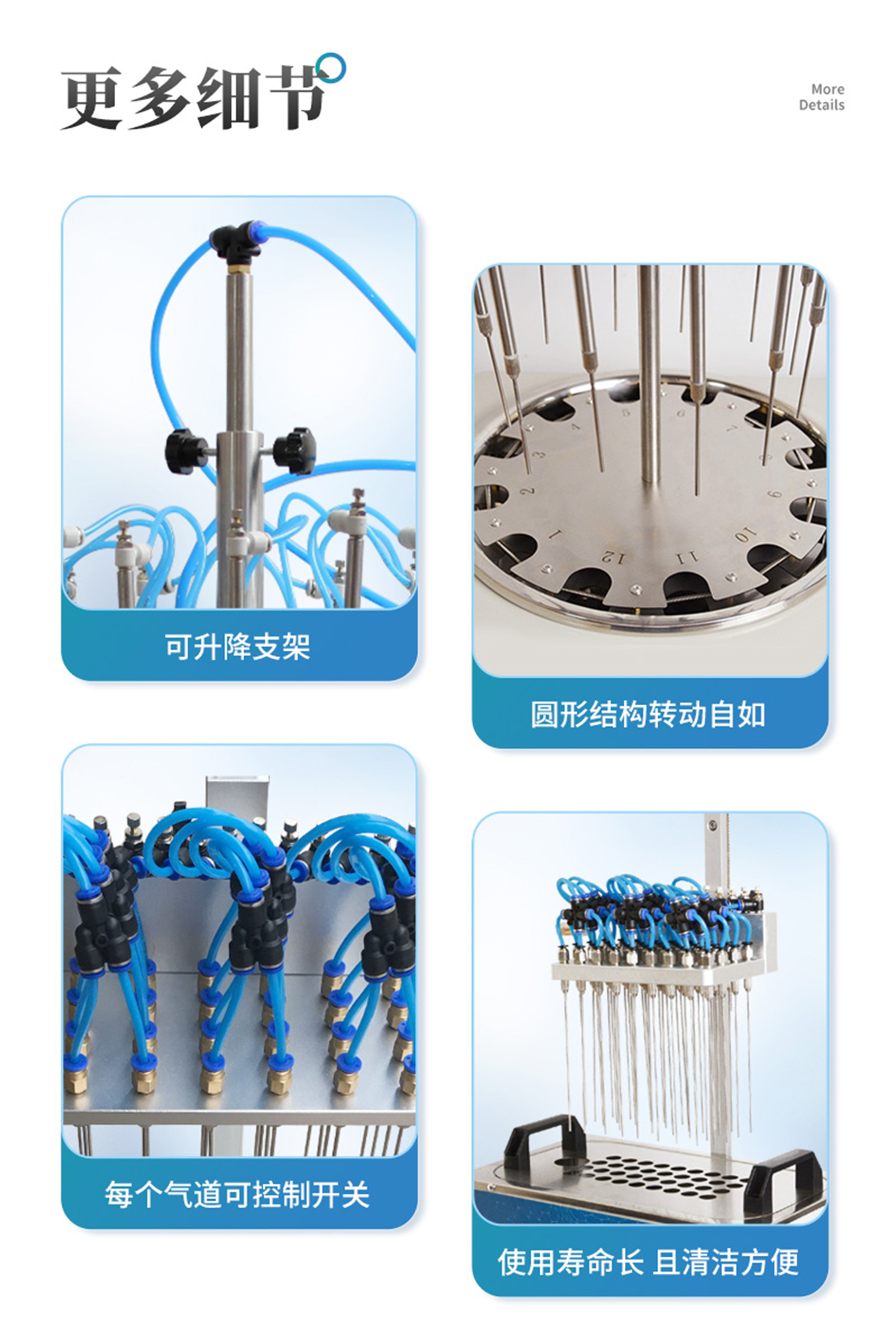| 分配室上各氣針通道可組合使用或單獨使用,每一路氣針均可單獨開關。分配室的高度可視需要調節。 | 每一路氣體流量可單獨進行調節,克服了不可調氮吹儀各氣路氣流量大小不一的弱點。 | 數字溫控器,雙數字顯示. | 可能與溶劑接觸的部件均采用不銹鋼材料、合金鋁并表面進行塑料噴涂,使用壽命長且清潔方便。 | 整機可放入通風櫥中使用。 | 一般標配的加熱塊規格為孔徑∮16mm。 |