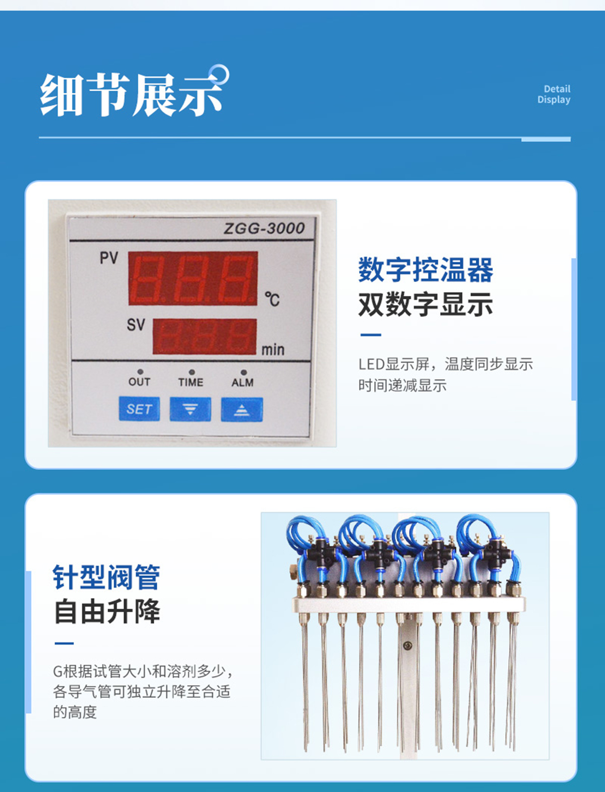 | 每個吹針都可以獨立控制,避免引起交叉污染。 | 儀器氣腔高度可以自行調(diào)節(jié),配備標(biāo)準(zhǔn)氣針長度為15厘米。 | 氮吹儀有36個氣道控制開關(guān),節(jié)約氣體,每根吹氣針的位置可獨立改變吹掃位置,使之適用不同的樣品容器及不同的樣品位置 | 在濃縮有毒溶劑時,整個系統(tǒng)可置于通風(fēng)柜中,降低危險。 | 內(nèi)置超溫保護裝置,自動故障檢測及報警功能,方便實用。 | 儀器有LED顯示屏,溫度同步顯示、時間遞減顯示,可時時觀察溫度變化。 | 具有整體溫度更均勻,加熱速度快 | 本產(chǎn)品還可以作為普通的干式恒溫器使用 | 使用起來更簡便,而且溫度也可以達到150℃,可以更好濃縮樣品 |
