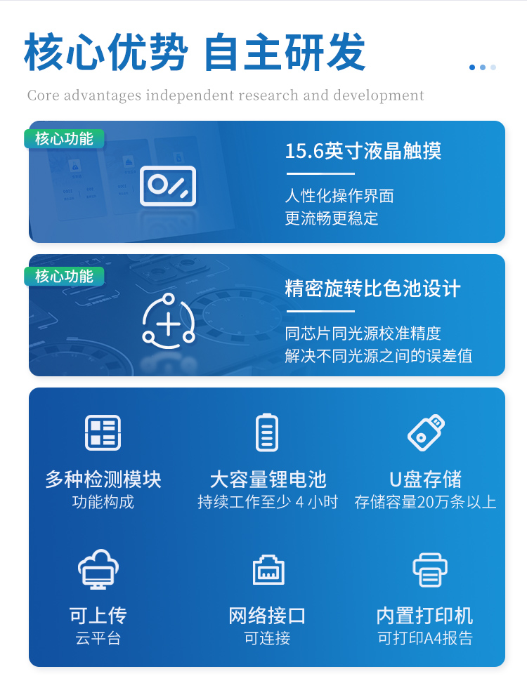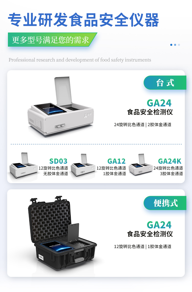 | 儀器采用臺式一體化系統檢測技術,將分光光度模塊、新型農殘檢測模塊、數字化管理模塊、無線通訊模塊高度集成于一體,支持檢測200種食品安全檢測項目,同時預留升級檢測方法。 | 儀器檢測模塊標準化、智能化,可隨意自由組合。檢測箱體內置多個標準檢測單元,檢測模塊可以調整配置。 | 儀器采用全新安卓智能系統,主控芯片采用 ARM Cortex-A7,RK3288/4核處理器,10.1寸高清液晶觸摸豎屏,更加**的UI交互界面,運轉快捷;儀器配備無線通信模塊: 4G(APN)通訊模塊、Wifi模塊,藍牙傳輸,同時具有雙USB接口以及RJ45接口能以多種方式實現數據保存和數據傳輸功能。 | 創新檢測模式: | ★檢測通道:≥12通道;采用精密旋轉比色池設計,使用同芯片同光源校準精度,解決不同光源之間的誤差值。1-12通道間誤差0.1%。(**號:ZL202022821055.2) | ★儀器具有自動識別比色皿檢測功能,即:將樣品比色皿放入儀器后,點擊樣品檢測,儀器自動識別比色皿進行通道檢測。 | 進口高精光源: | 高精度進口四波長冷光源,通道配置 410、520、590、630nm 波長光源,一個光源芯片驅動一個光源,誤差極小,每臺設備單獨**校準光源,**比對,同時參照四種不同波段光源全方位覆蓋市面上99%的農殘食品項目檢測。 | 智能化操作系統: | 便捷操作系統:設備檢測時可在同一檢測界面自動對應相關檢測通道一次性選擇1-12個樣品名稱,無須退出界面,節省操作時間。 | 數據集成系統:設備首頁自動統計檢測數據包含:周檢測數據、月檢測數據,全部檢測總數量,均包含檢測總數,合格數,不合格數,以及相關柱形分析圖,對各項檢測數據清晰掌握,無需電腦查詢,更加快捷直觀。 | 項目預設系統:支持添加單個及多個相同或不相同的任務預設,一鍵快速調取,每一個任務分別可以設置不同的樣品、批次、編號、來源、備注、抽樣信息、檢測信息、受檢信息、復核信息等更多信息。無縫鏈接平臺和APP實時查看下發任務。 | 數據監管系統:同步對接監管平臺,數據可局域網和互聯網數據上傳,檢測結果可選擇直接傳至食品安全監管平臺。集成OSS輸出存儲服務、區分設備定向管理應用,進行區域食品安全監管及大數據分析處理與數據統計,檢測區域食品安全長短期動態,達到食品安全問題預估、預警。 | 自定義打印系統:內置全新打印系統,新創自定義打印方式,可按需靈活設置開啟或關閉:產品合格證(國家農業部標準要求),二維碼,抽樣信息、檢測信息,受檢信息、復核信息、抽樣日期、檢測日期等信息的打印。 | 系統遠程更新功能:可定向分客戶分儀器更新系統,按照不同客戶后期實際需求添加項目,無需機器返廠,即可遠程實時升級全新系統,節省時間成本及避免運輸造成設備損壞。 | 儀器主機采用一體化防水、抗壓、防撞擊、防腐蝕箱體設計,同時配備交直流供電,可連接車載電源,可選配大容量充電鋰電池,滿足現場野外檢測需求。 | 安全證書,放心保障:儀器具有中國計量科學研究院校準證書,**認證。 |