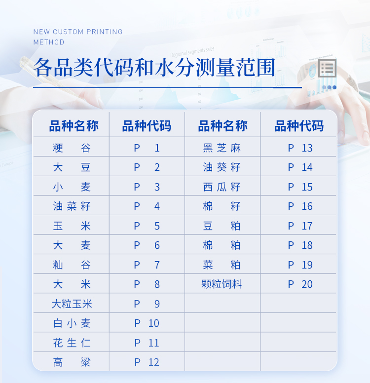 | 測量范圍:可測量谷類、玉米、東北玉米、大麥、小麥、白小麥、大米、豆粕、花生仁、菜粕、高粱、黑芝麻、棉籽、棉粕、秈谷、大豆、油菜籽、飼料、蔬菜種子等非金屬顆粒狀物質。 | 快速準確:數秒內即可顯示結果,測量誤差≤±0.5℅ | 操作簡單:20個常見品種已預先定標,不需秤樣、用料簡取樣后可立即測量水分 | 水分測量范圍:3-35℅ | 使用環境溫度:0~40℃ | 溫度補償:自動 | 定 標:浮動四點定標,品種不限(常見品種20個已預先定標,可直接測量) | 工作電源:直流6V(5號干電池四節) | 自動關機:超過三分鐘無操作自動關機。 | 便攜方便:重約1千克、外型小巧、電源交直流二用,適合各種工作場合 | 適合國情:用戶可對本地特殊品種采用本機獨創的四點定標法自行定標,自行修正水分值 | 高性價比:技術含量高,性能**而價格相比同類產品較低。 |