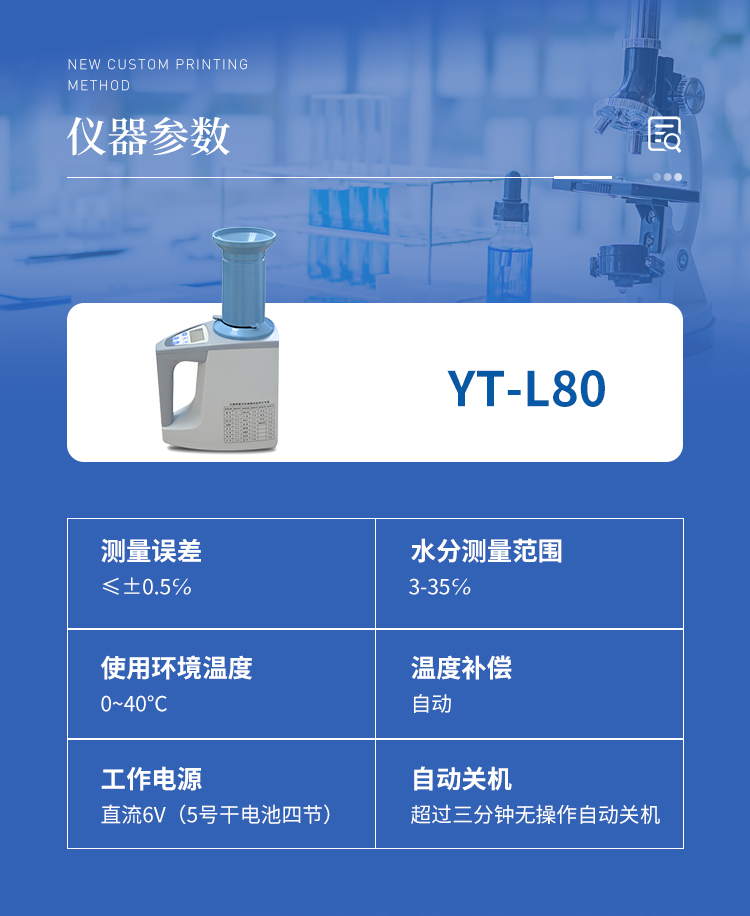TY-L80型糧食水分測定儀是老型糧食水分測定儀的升級產品、在原來的基礎上增加了自動累加測量次數,計算平均值功能和容量自動換算顯示功能,其性能更穩定可靠,擁有外觀設計國家**,外形新穎美觀,完**與國外同類產品媲美,是水分測量儀器理想的升級換代產品。