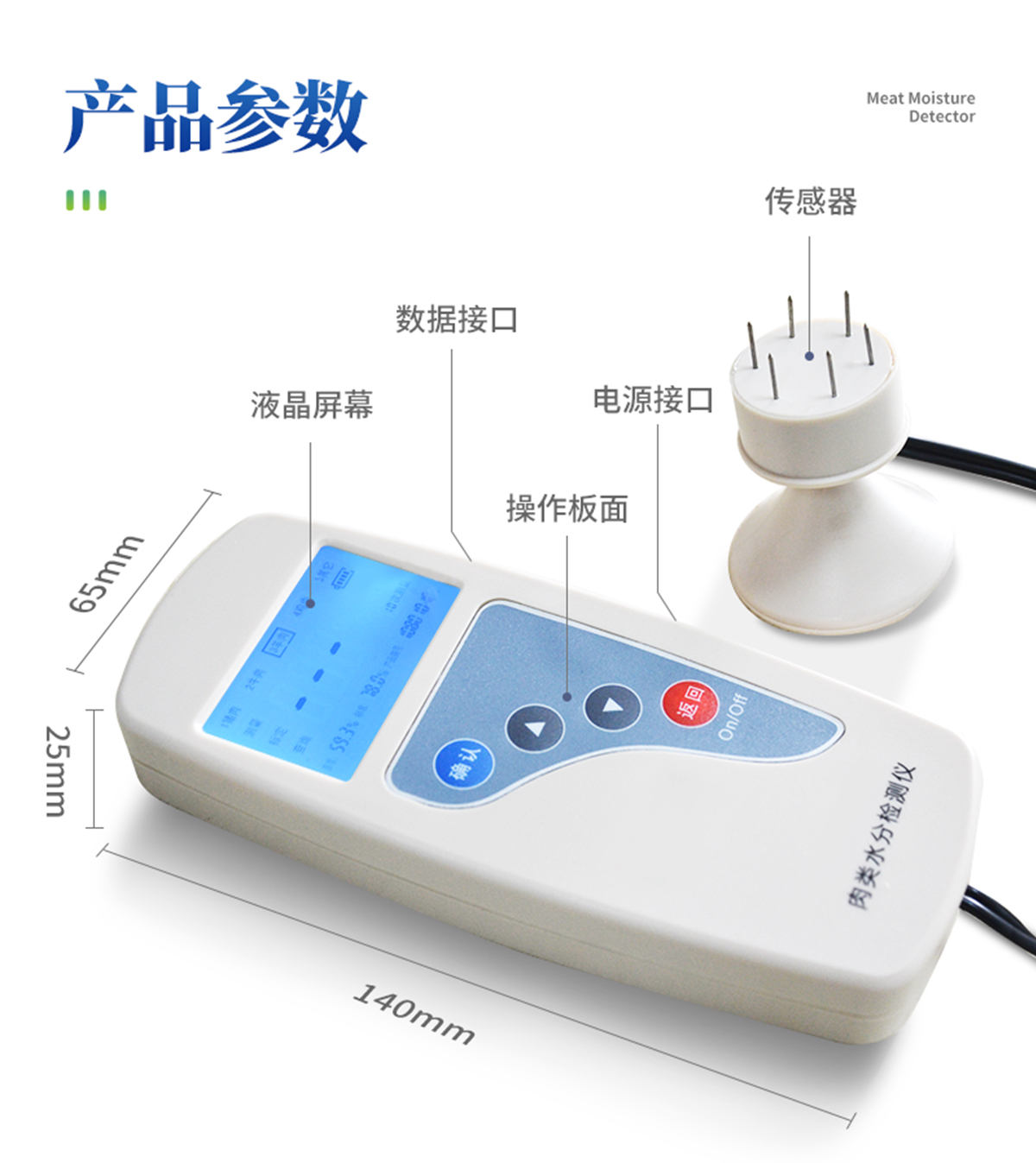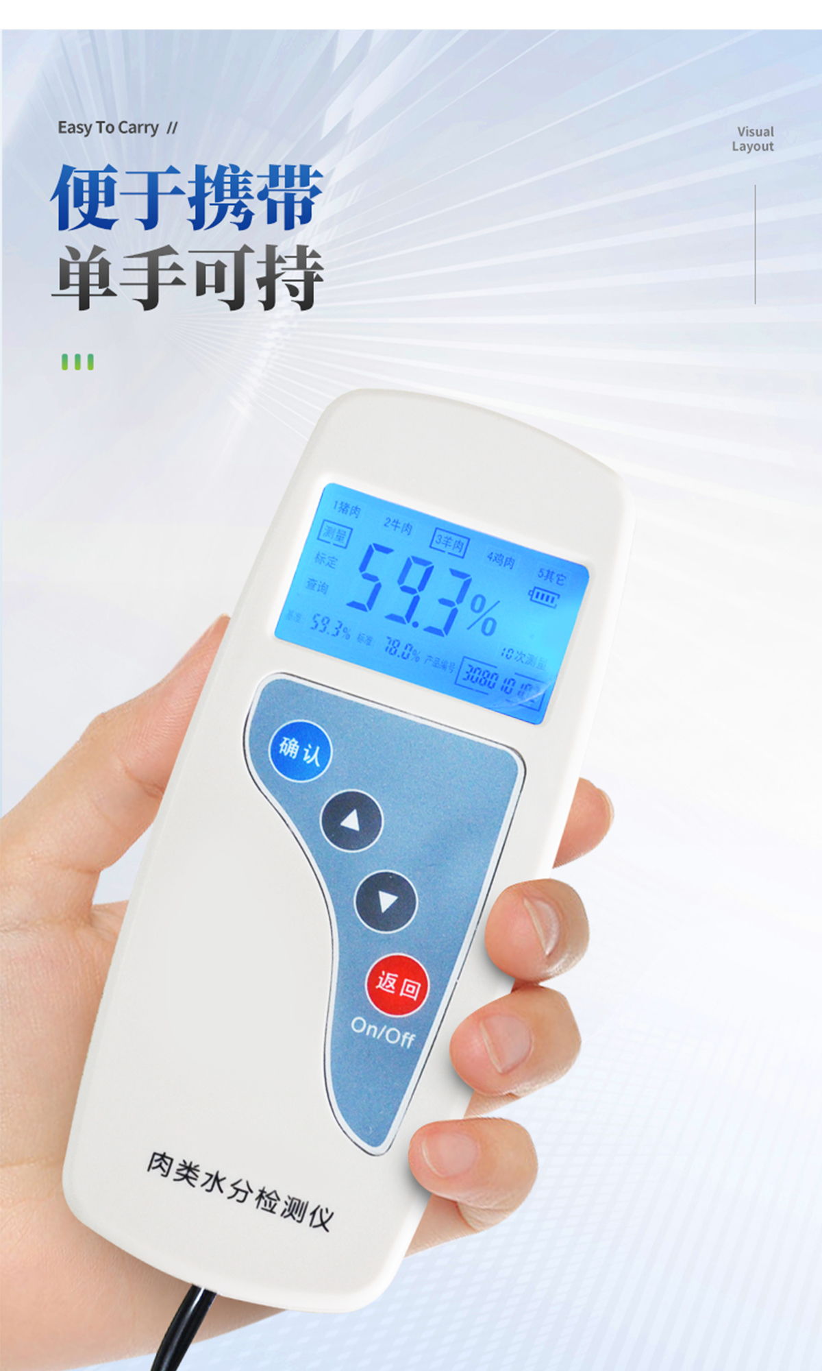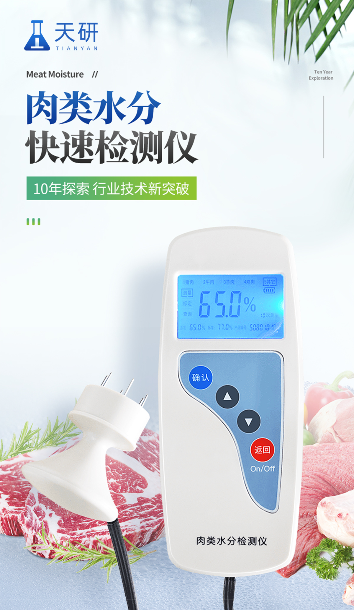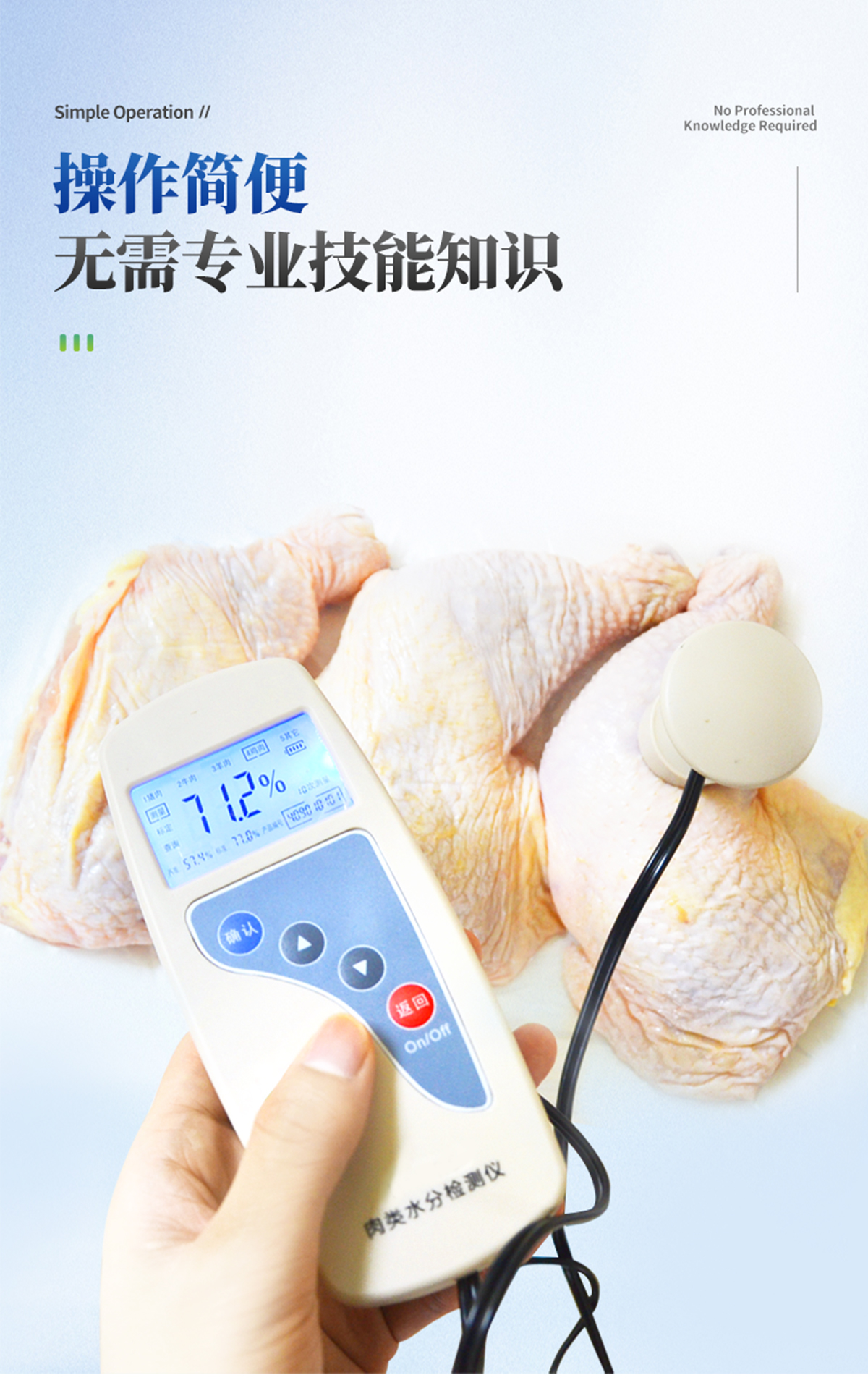 肉類水分檢測儀主要用于快速豬肉、牛肉、雞肉等動物肉類水分含量,從而判斷所測樣品是否為注水肉,該儀器設計精巧,單手可持,儀器可根據測定對象的品種,設定相應的判斷標準值。