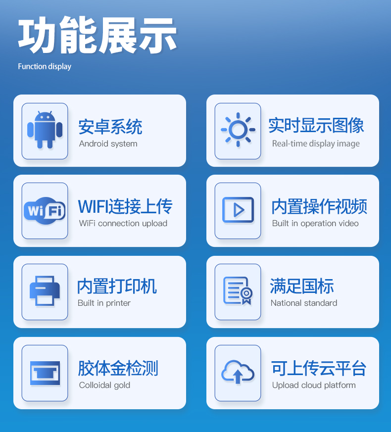 | 儀器采用10.1英寸液晶觸摸屏顯,搭配運行安卓智能操作系統,主控芯片采用ARM Cortex-A7,RK3288/4核處理器,主頻1.88Ghz,運轉速度更快速,性能更強。 | 儀器功能包括:膠體金檢測模塊、數字化管理模塊、無線通訊模塊等,可以滿足同一軟件下實現所有檢測項目的檢測,并在同一窗口展示檢測結果。 | 一體化便攜式快檢設備,采用交直流兩用供電方式,可連接車載電源,配備6ah大容量充電鋰電池,可以滿足現場及流動檢測使用的需求。儀器尺寸:43×35×20cm, 主機凈重:5.1kg | 系統自帶數據集成模塊,設備首頁自動統計檢測數據包含:周檢測數據、月檢測數據,全部檢測總數量,均包含檢測總數,合格數,不合格數,以及相關柱形分析圖,對各項檢測數據清晰掌握,無需電腦查詢,更加快捷直觀。 | 儀器具有任務預設模塊,可在樣品送檢前提前預設樣品名稱、檢測指標、送檢單位等信息,樣品送檢時一鍵調取保存信息,檢測更加方便快捷。 | 膠體金檢測模塊:軌道式自動傳輸掃描方式,可實時顯示金標卡實時圖像,系統自動分析并呈現出CT曲線圖,CT線自動識別,無需手動調整,完成檢測后自動退出檢測卡。 結果判定線可修改,對照值標定值可保存,斷電不丟失數據。 兼容市場上其他膠體金卡,使用耗材不受限制,極大增強用戶使用體驗。 | 儀器檢測系統擁有龐大數據庫,并且構建了完善的檢索、修訂功能。食品庫涵蓋多種樣品名稱,可按需添加或刪除、編輯樣品名稱;產品數據庫以及歷史檢測記錄支持一鍵檢索功能。 | 系統打印自定義化,打印格式多樣化,產品合格證(國家標準要求),二維碼,抽樣信息、檢測信息,受檢信息、復核信息、抽樣日期、檢測日期等信息結果,可按需求自行設置打印內容。 | A4紙版本報告打印功能(可選配):設備擁有兩種結果展示方式,可以自動生成A4打印模板和小票打印模板兩種樣式,可通過WiFi及網線等方式鏈接外置打印機可進行打印 | 儀器具有 wifi 聯網上傳、RJ45網線連接功能,可以快速上傳數據。同步對接監管平臺,數據可局域網和互聯網數據上傳,檢測結果直接傳至食品安全監管平臺。進行區域食品安全監管及大數據分析處理與數據統計,檢測區域食品安全長短期動態,達到食品安全問題預估、預警。 | 設備支持U盤存儲,標準USB接口,免驅動安裝。檢測結果存儲容量20萬條以上,可生成Excel表格,進行一鍵拷貝,并具有登錄保護功能,可設置用戶名及密碼,規范不同人員操作權限,防止非工作人員操作,并且可以進行重新校準、鎖定、恢復出廠設置功能。儀器固件可升級,后期檢測項目可擴充。 | 儀器具備遠程升級功能,可定向分客戶分儀器更新,開機后自動更新,并可持續性免費更新系統版本,無需像傳統產品返廠更新,節省時間及人力成本并避免了物流運輸返廠升級導致設備損壞的潛在風險。 |