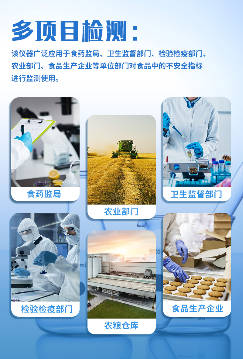 金標(biāo)度數(shù)儀快速定量檢測(cè)獸藥殘留、抗生素類殘留、激素類殘留、毒素類殘留,化學(xué)類殘留等幾十種項(xiàng)目并可根據(jù)用戶需要擴(kuò)充新的檢測(cè)項(xiàng)目如農(nóng)藥殘留、食品添加劑、色素、可現(xiàn)場(chǎng)快速檢測(cè)農(nóng)藥殘留、鹽酸克倫特羅、沙丁胺醇、萊克多巴胺、四環(huán)素類、硝基呋喃類、磺胺類、沙星類、氯霉素、孔雀石綠磺胺類、豬藍(lán)耳病毒、豬瘟病毒、黃曲霉毒素B1、豬偽狂犬病毒、豬偽狂犬病毒gE蛋白、豬口蹄疫3ABC蛋白、豬口蹄疫病毒IgG、豬細(xì)小病毒、雞禽流感等定性和定量快速檢測(cè)等、并且可以連接食品安全監(jiān)控系統(tǒng)。