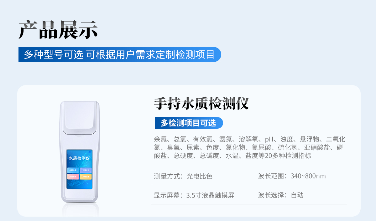 水產養殖水質檢測儀適用于純凈水廠、自來水廠、生活污水處理廠、工業污水、水產養殖、河流監測、游泳場館、水源保護、生產監測、科研實驗等。