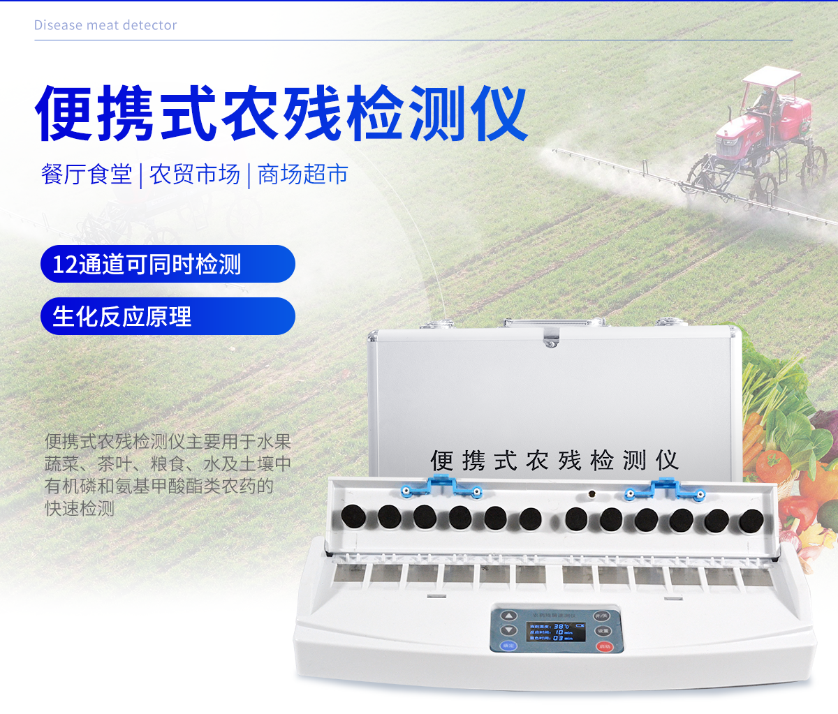 主要用于水果、蔬菜、茶葉、糧食、水及土壤中有機磷和氨基甲酸酯類農藥的快速檢測,特別適用于各級食品安全檢測機構現場執法使用,此外還可用于果蔬茶生產基地和農貿批發銷售市場現場檢測,餐館、食堂、家庭果蔬加工前的安全速測等