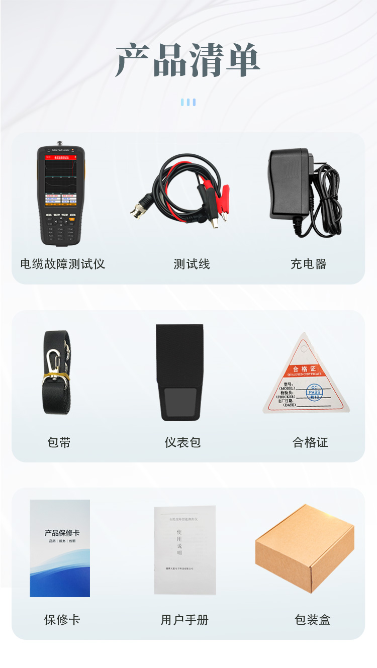 | 電纜故障測(cè)試儀......1 | 測(cè)試線(xiàn)X......1 | 充電器......1 | 包帶......1 | 儀表包......1 | 合格證......1 | 保修卡......1 | 用戶(hù)手冊(cè)......1 | 包裝盒......1 |