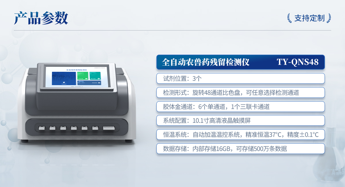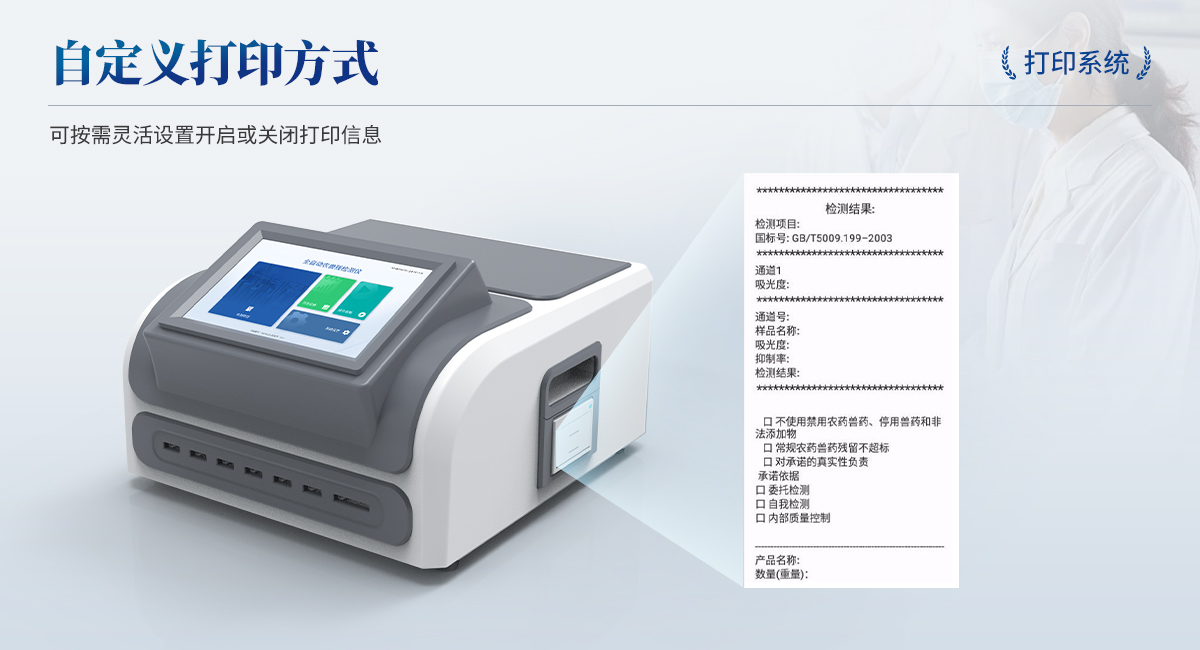 | 1. 試劑位置:3個 | 2. 農殘檢測盤:旋轉48通道比色盤,可任意選擇檢測通道,自動對應選擇通道。 | 3. 膠體金通道:6個單通道,1個三聯卡通道,可讀取檢測卡結果,自動采集、處理分析,自動判斷檢測結果,并具備自動判空功能。 | 4.系統配置:10.1寸高清液晶觸摸屏,采用ARM Cortex-A7,RK3288/4核處理器,運行內存1GB。Android7.1.1 系統分辨率1280×800。 | 5.恒溫系統:具有自動加溫溫控系統,精準恒溫37℃,精度±0.1℃。 | 6.添加系統:儀器按照試劑要求自動、按時、按量加入試劑,并且自動對未正常放置的樣本或異常的樣本進行檢查并提示。 | 7.清洗功能:儀器具備回流及自動清洗管路功能,避免試劑污染。 | 8.混勻功能:設備具備自動混勻功能。 | 9.光源校準:設備可自動校準,確保檢測準確度。 | 10.實時監控:儀器測試過程中屏幕顯示運行狀態,可實時查看。 | 11.數據存儲:內部存儲16GB,可存儲500萬條數據。 | 12.樣品多選功能:設備具備樣品一鍵多選功能,選擇樣品自動匹配檢測通道。 | 13.項目預設:可提前設置單個及多個相同或不相同的檢測任務,可單次或者多次調取,減少檢測時間。 | 14.自定義打印系統:內置自定義打印系統,可按需靈活設置開啟或關閉:產品合格證(國家農業部標準),二維碼,抽樣信息、檢測信息,受檢信息等信息的打印。 | 15.A4版本報告打印功能:設備可自動生成A4版報告,A4報告帶二維碼,可掃描二維碼生成電子版,并可識別真偽。 | 16.傳輸方式:儀器配備無線通信模塊: 4G(APN)通訊模塊、Wifi模塊,藍牙傳輸模塊,同時具有USB接口以及RJ45接口能以多種方式實現數據保存和數據傳輸功能,設備數據可以同步上傳至平臺。 | 17.數據監管系統:設備自帶監管平臺,并可同步對接監管平臺,數據可局域網和互聯網數據上傳,檢測結果可直接傳至食品安全監管平臺。達到食品安全問題預估、預警。 | 18.系統遠程更新功能:無需設備返廠,即可遠程實時升級全新系統,節省時間成本及避免運輸造成設備損。 |