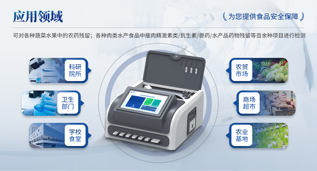 全自動農獸藥殘留檢測儀可對各種蔬菜水果中有機磷和氨基甲酸酯類農藥殘留;各種肉類水產食品中瘦肉精激素類殘留,抗生素殘留,獸藥殘留,水產品藥物殘留等百余種項目進行快速檢測。該設備廣泛應用于蔬菜批發市場、超市、商場、食藥監等部門的蔬菜和水果中的農藥殘留檢測。