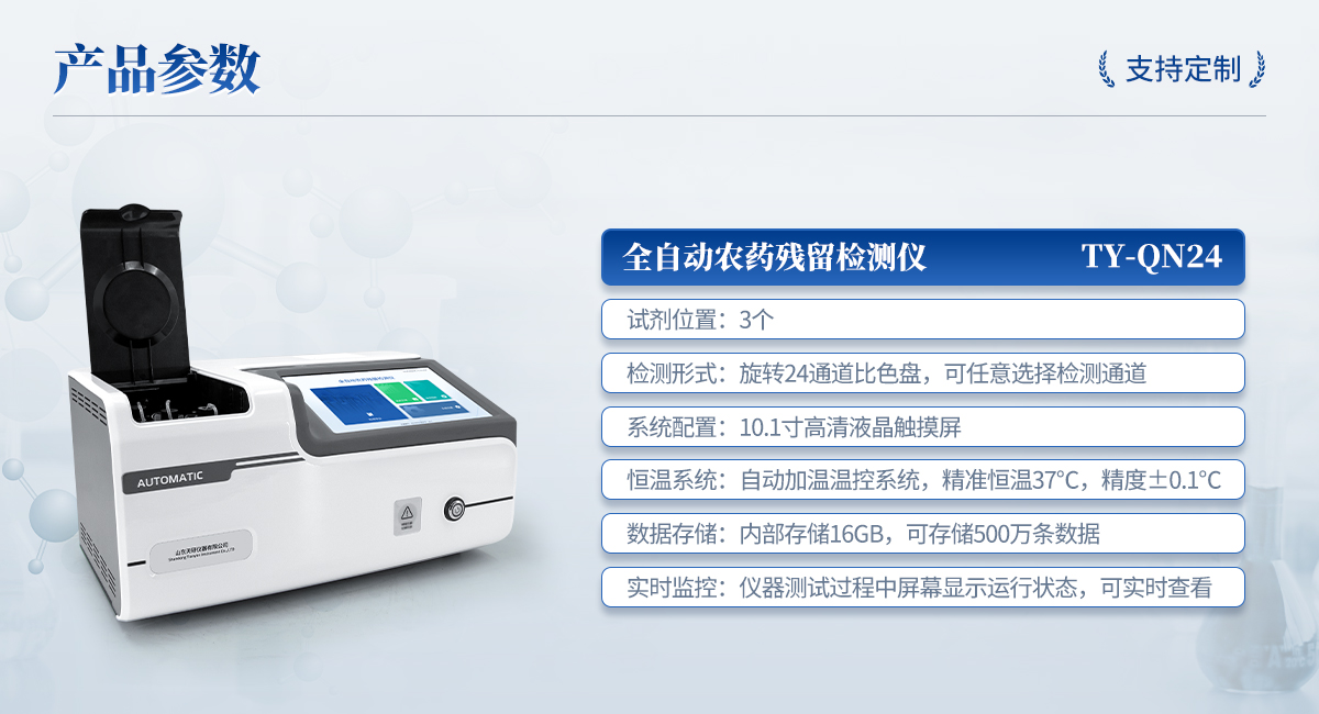| 1. 試劑位置:3個(gè) | 2. 檢測形式:旋轉(zhuǎn)24通道比色盤,可任意選擇檢測通道,自動(dòng)對(duì)應(yīng)選擇通道。 | 3. 系統(tǒng)配置:10.1寸高清液晶觸摸屏,采用ARM Cortex?-A7,RK3288/4核處理器,運(yùn)行內(nèi)存1GB。Android7.1.1 系統(tǒng)分辨率1280×800。 | 4.恒溫系統(tǒng):具有自動(dòng)加溫溫控系統(tǒng),精準(zhǔn)恒溫37℃,精度±0.1℃。 | 5.添加系統(tǒng):儀器按照試劑要求自動(dòng)、按時(shí)、按量加入試劑,并且自動(dòng)對(duì)未正常放置的樣本或異常的樣本進(jìn)行檢查并提示。 | 6.清洗功能:儀器具備回流及自動(dòng)清洗管路功能,避免試劑污染。 | 7.混勻功能:設(shè)備具備自動(dòng)混勻功能。 | 8.光源校準(zhǔn):設(shè)備可自動(dòng)校準(zhǔn),確保檢測準(zhǔn)確度。 | 9.實(shí)時(shí)監(jiān)控:儀器測試過程中屏幕顯示運(yùn)行狀態(tài),可實(shí)時(shí)查看。 | 10.數(shù)據(jù)存儲(chǔ):內(nèi)部存儲(chǔ)16GB,可存儲(chǔ)500萬條數(shù)據(jù)。 | 11.樣品多選功能:設(shè)備具備樣品一鍵多選功能,選擇樣品自動(dòng)匹配檢測通道。 | 12.項(xiàng)目預(yù)設(shè):可提前設(shè)置單個(gè)及多個(gè)相同或不相同的檢測任務(wù),可單次或者多次調(diào)取,減少檢測時(shí)間。 | 13.自定義打印系統(tǒng):內(nèi)置自定義打印系統(tǒng),可按需靈活設(shè)置開啟或關(guān)閉:產(chǎn)品合格證(國家農(nóng)業(yè)部標(biāo)準(zhǔn)),二維碼,抽樣信息、檢測信息,受檢信息等信息的打印。 | 14.A4版本報(bào)告打印功能:設(shè)備可自動(dòng)生成A4版報(bào)告,A4報(bào)告帶二維碼,可掃描二維碼生成電子版,并可識(shí)別真?zhèn)巍?/td> | 15.傳輸方式:儀器配備無線通信模塊: 4G(APN)通訊模塊、Wifi模塊,藍(lán)牙傳輸模塊,同時(shí)具有USB接口以及RJ45接口能以多種方式實(shí)現(xiàn)數(shù)據(jù)保存和數(shù)據(jù)傳輸功能,設(shè)備數(shù)據(jù)可以同步上傳至平臺(tái)。 | 16.數(shù)據(jù)監(jiān)管系統(tǒng):設(shè)備自帶監(jiān)管平臺(tái),并可同步對(duì)接監(jiān)管平臺(tái),數(shù)據(jù)可局域網(wǎng)和互聯(lián)網(wǎng)數(shù)據(jù)上傳,檢測結(jié)果可直接傳至食品安全監(jiān)管平臺(tái)。達(dá)到食品安全問題預(yù)估、預(yù)警。 | 17.系統(tǒng)遠(yuǎn)程更新功能:無需設(shè)備返廠,即可遠(yuǎn)程實(shí)時(shí)升級(jí)全新系統(tǒng),節(jié)省時(shí)間成本及避免運(yùn)輸造成設(shè)備損。 |