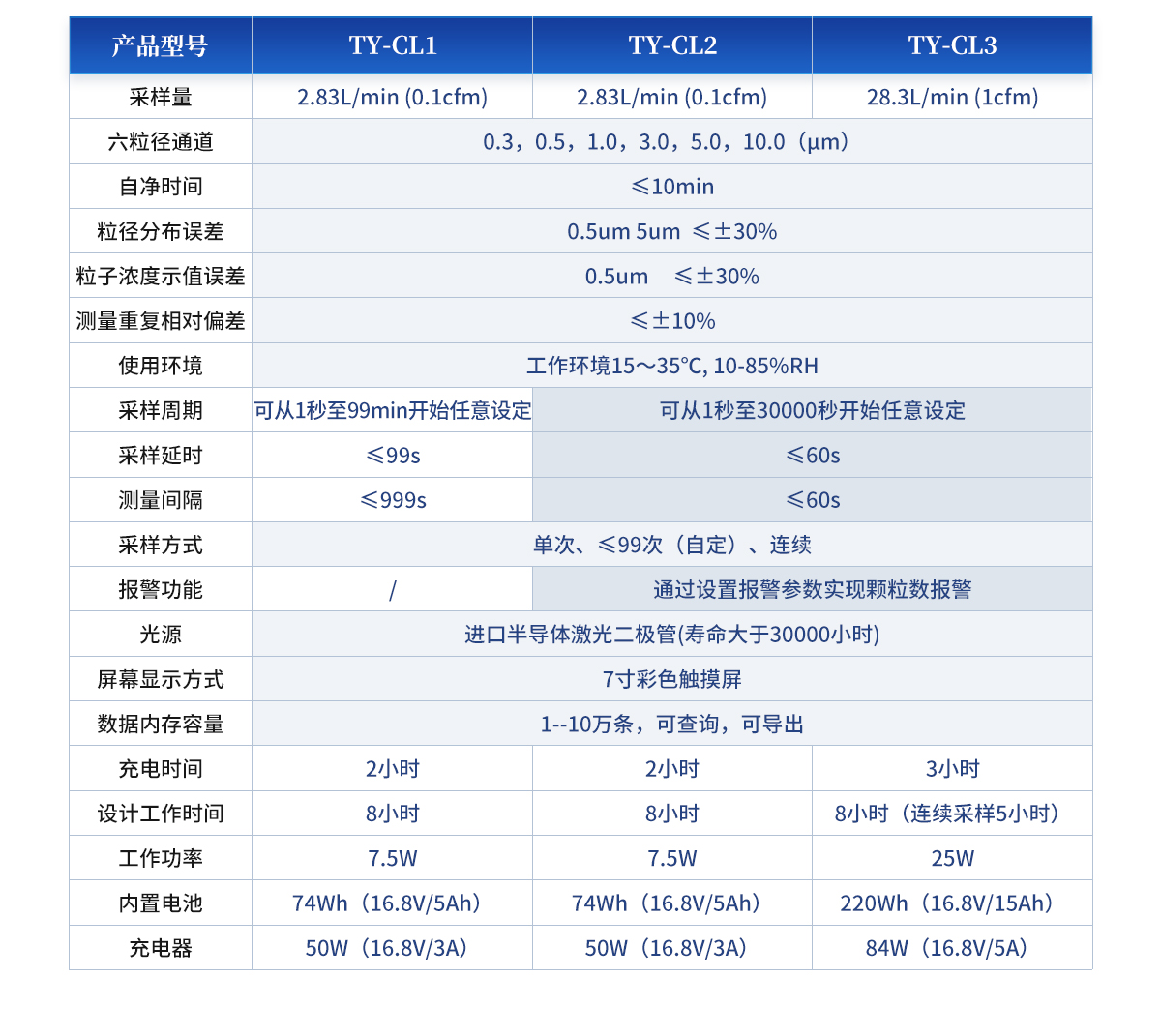 | 采樣量:2.83L/min (0.1cfm) | 六粒徑通道:0.3,0.5,1.0,3.0,5.0,10.0(μm) | 自凈時間:≤10min | 粒徑分布誤差:0.5um 5um ≤±30% | 粒子濃度示值誤差:0.5um ≤±30% | 測量重復相對偏差:≤±10% | 使用環境:工作環境15~35℃, 10-85%RH | 采樣周期:可從1秒至30000秒開始任意設定 | 采樣延時:≤60s | 測量間隔:≤60s | 采樣方式:單次、≤99次(自定)、連續 | 報警功能:通過設置報警參數實現顆粒數報警 | 光源:進口半導體激光二極管(壽命大于30000小時) | 屏幕顯示方式:7寸彩色觸摸屏 | 數據內存容量:1--10萬條,可查詢,可導出。 | 充電時間:2小時 | 設計工作時間:8小時 | 平均功率:7.5W | 內置電池:74Wh(16.8V/5Ah) | 充電器:50W(16.8V/3A) |