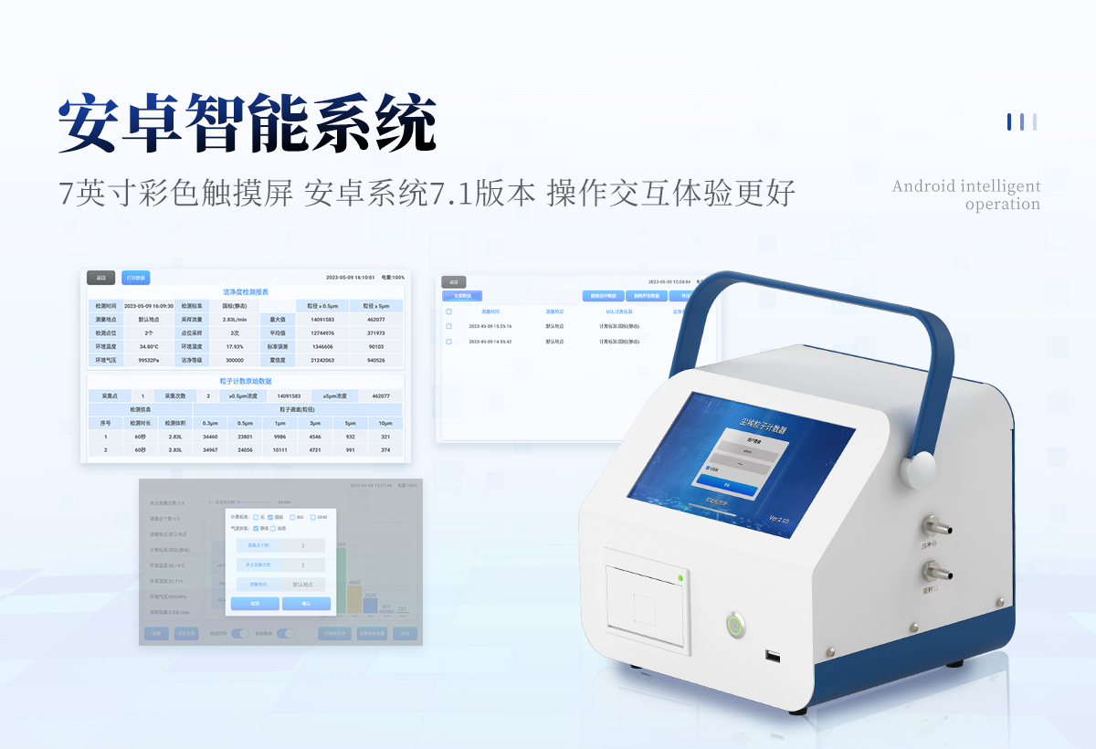 | 1、安卓系統7.1版本,操作交互體驗更好。 | 2、內置溫濕度傳感器、環境氣壓傳感器 | 3、核心部件光散射傳感器明顯消除腔體的雜散光,信噪比大為提高。從而使測量更準確更可靠。 | 4、按95%置信度(UCL)計算,計數結果可換算成m3和ft3 | 5、依照凈化級別劃分和規定,自動判定凈化級別,使用便利。 | 6、帶審計追蹤功能,可查詢、可追溯、可控制,符合FDA 21CFR PART11規范 | 7、支持wifi、藍牙傳輸,數據可無線上傳;同時支持U盤拷貝數據,免驅動插拔。 | 8、配置監管平臺,檢測結果可直接無線傳至平臺,進行潔凈度長短期分析,輔助管理。 | 9、內置新一代高速熱敏打印機,可選擇所需要打印的粒徑通道,靈活打印結果。 | 10、交直流兩用,內置充電鋰電池,環保耐用可支持連續采樣6小時以上。 | 11、便捷簡易伸縮式云臺支架,安裝采樣操作更加方便。 |