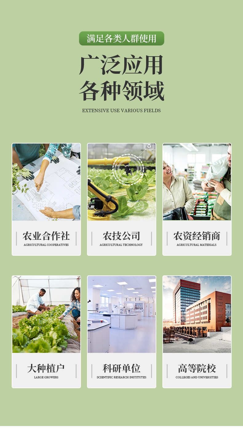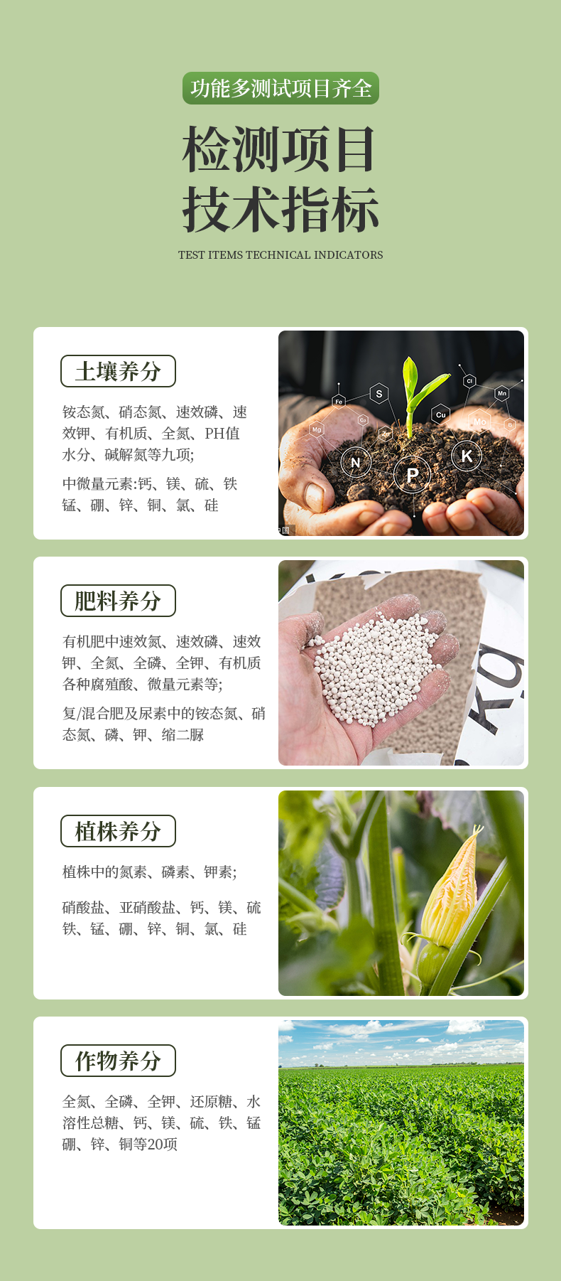 | 土壤養分:●銨態氮、硝態氮、速效磷、速效鉀、有機質、全氮、堿解氮、pH值、含鹽量、水分等十項; ● 中微量元素:鈣、鎂、硫、鐵、錳、硼、鋅、銅、氯、硅等。 | 肥料養分:● 單質化肥中的氮、磷、鉀; ● 復(混)合肥及尿素中的銨態氮、硝態氮、磷、鉀、縮二脲; ● 有機肥中速效氮、速效磷、速效鉀、全氮、全磷、全鉀、有機質,各種腐植酸、微量元素(鈣、鎂、硫、鐵、錳、硼、鋅、銅、氯、硅)等。 | 植株養分:● 植株中的氮素、磷素、鉀素;硝酸鹽、亞硝酸鹽;鈣、鎂、硫、鐵、錳、硼、鋅、銅、氯、硅等項。 | 煙葉養分:全氮、全磷、全鉀、還原糖、水溶性總糖、硼、錳、鐵、銅、鈣、鎂等20項。 |
