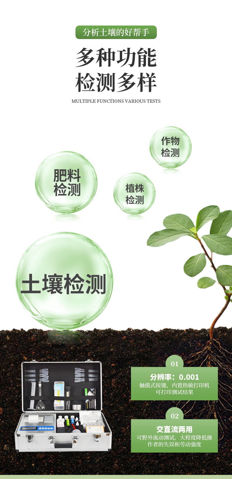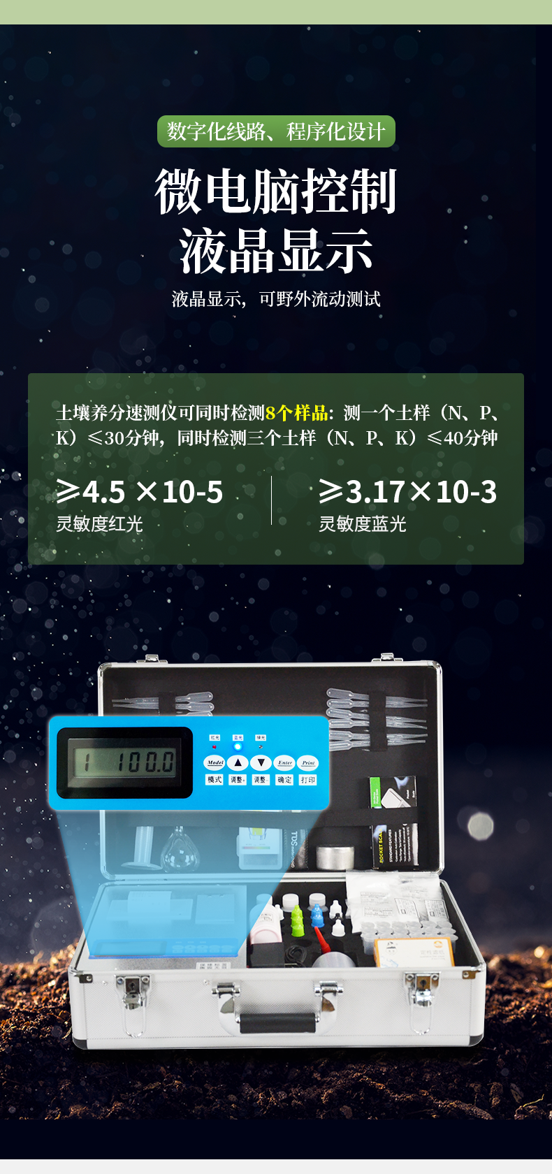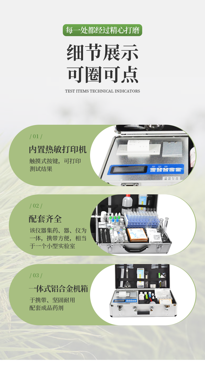 | 全項目土壤肥料養分速測儀功能全:測試項目國內外*全(各類藥劑均可選購)。 | 配套齊全:該儀器集藥、器、儀為一體,攜帶方便,相當于一個小型實驗室。適于農業服務部門或農資經銷商、肥料廠商測土施肥和鑒別肥料真假。 | 操作簡便、速度快捷,成品藥劑開瓶即用,無須配置。 |