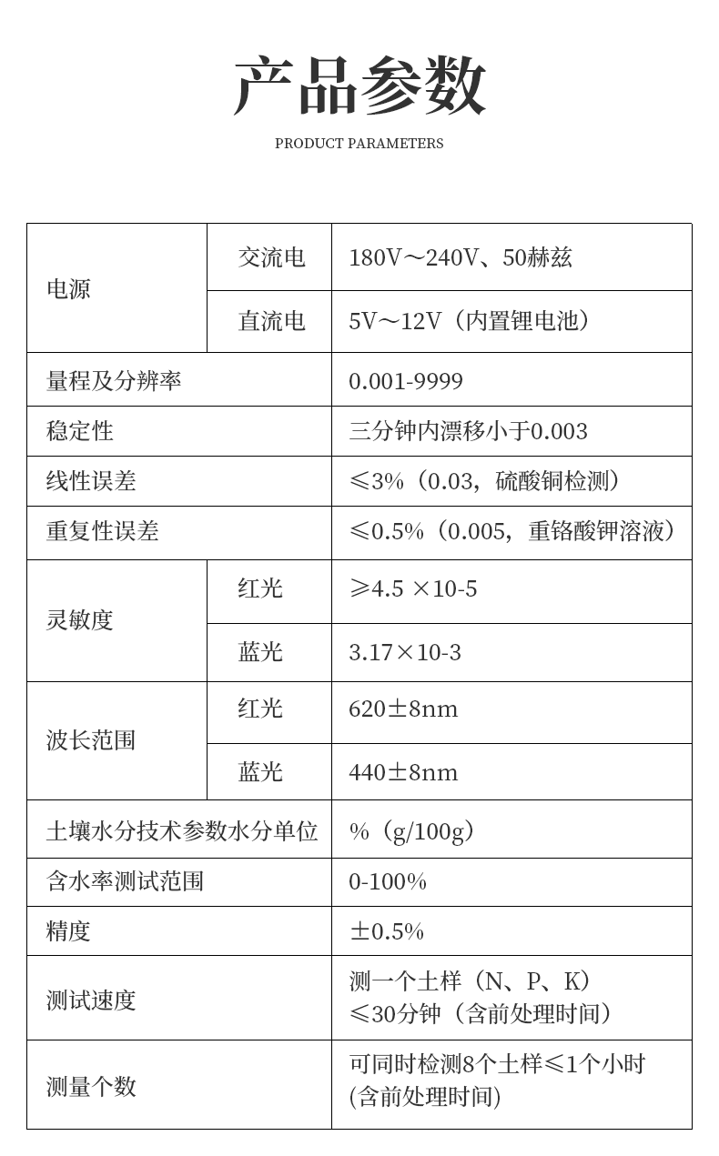 | 電源:交流 220±22V 直流 12V+5V(可用車載電源也可選擇儀器內置鋰電池) | 功率: ≤5W | 量程及分辨率:0.001-9999 | 重復性誤差: ≤0.3%(0.003,重鉻酸鉀溶液) | 儀器穩定性:三分鐘內漂移小于0.2%(0.002,透光度測量)。儀器開機預熱5分鐘后,兩分鐘內顯示數字無漂移(透光度測量),五分鐘內數字漂移不超過0.3%(透光度測量);二十分鐘內數字漂移不超過0.5%(透光度測量)、0.001(吸光度測量);三十分鐘內數字漂移不超過0.7%(透光度測量)、0.002(吸光度測量)。 | 線性誤差: ≤1%(0.01,硫酸銅檢測) | 靈敏度:紅光≥4.5 ×10-5 藍光≥3.17×10-3 綠光≥2.35×10-3 橙光≥2.13×10-3 | 波長范圍 :紅光:680±2nm; 藍光:420±2nm;綠光:510±2nm;橙光:590±4nm | PH值(酸堿度): (1)測試范圍:1~14 (2)精度:0.1 (3)誤差:±0.1(擴展) | 鹽量(電導):(1)測試范圍:0.01%~1.00% (2)相對誤差:±5%(擴展) | 土壤水分技術參數水分單位:﹪(g/100g);含水率測試范圍:0-100﹪;誤差小于0.5% | 土壤中速效N、P、K三種養分一次性同時浸提測定、科學指導施肥量 | 肥料中氮(N)、磷(P)、鉀(K)等養分同時、快速、準確檢測 | 測試速度:測一個土樣(N、P、K)≤30分鐘(含前處理時間,不需用戶提供任何附件) | 同時測8個土樣≤1小時(含前處理時間) | 數據查詢打印:測試數據可存儲、查詢、打印,內置新型一鍵式熱敏打印機 |