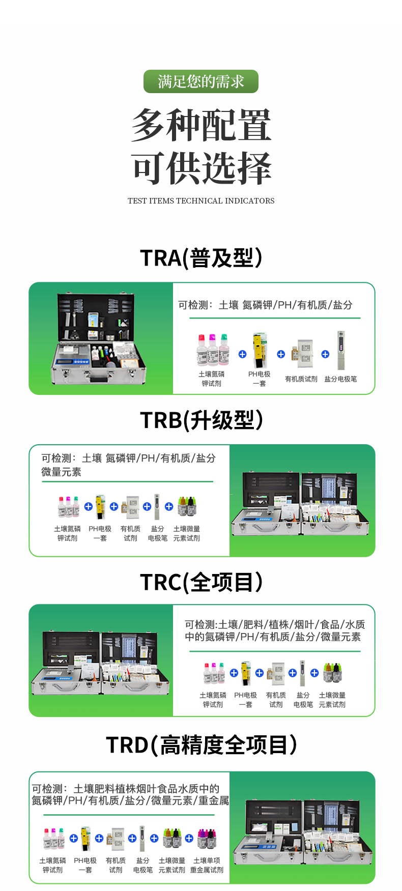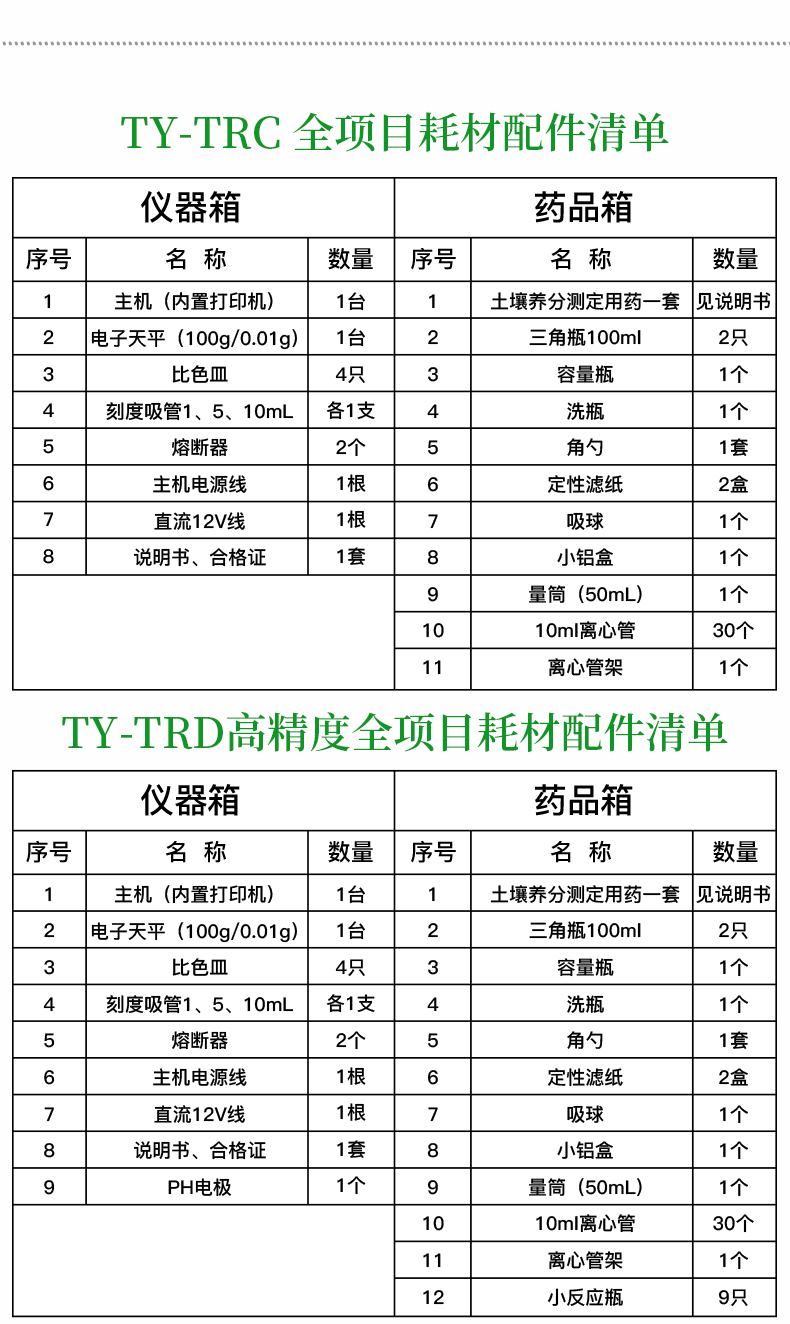 | 儀器整機質保五年,終身免費維修服務,免費郵寄儀器、免費培訓。 | 終身免費提供土肥等農業相關技術支持! | 土壤養分檢測儀配置清單(兩個鋁合金箱子): |