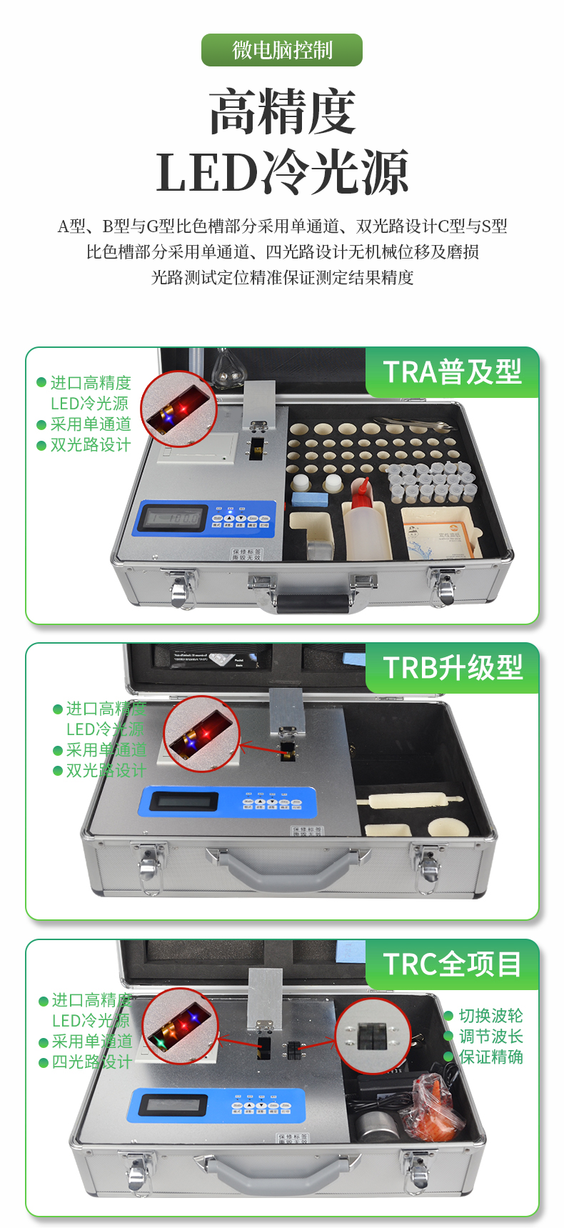 | 《機箱/藥劑一體式鋁合金機箱》設計,便于攜帶、堅固耐用,配套成品藥劑。 | 微電腦控制,數字化線路、程序化設計,液晶顯示,交直流兩用,可野外流動測試,大程度降低操作者的失誤和勞動強度。 | 分辨率:0.001,觸摸式按鍵,內置熱敏打印機,可打印測試結果。 | 全項目土壤肥料養分速測儀可檢測土壤及化肥、有機肥(含葉面肥、水溶肥、噴施肥等)、植株中的速效氮、速效磷、有效鉀、全氮、全磷、全鉀、有機質、酸堿度,鈣、鎂、硫、鐵、錳、硼、鋅、銅、氯、硅等各種中微量元素。 | 采用高亮LED光源,濾光式處理,保證光源波長穩定, 硅半導體作為信號接收系統, 壽命長達10萬小時級別。光源穩定,重現性好,準確度高。 | 比色槽部分采用單通道設計,無機械位移及磨損,光路測試定位**,保證測定結果精度。 | 配套專家施肥系統數據,可對百余種全國農業、果樹、 經濟作物的目標產量科學計算推薦施肥量。 |