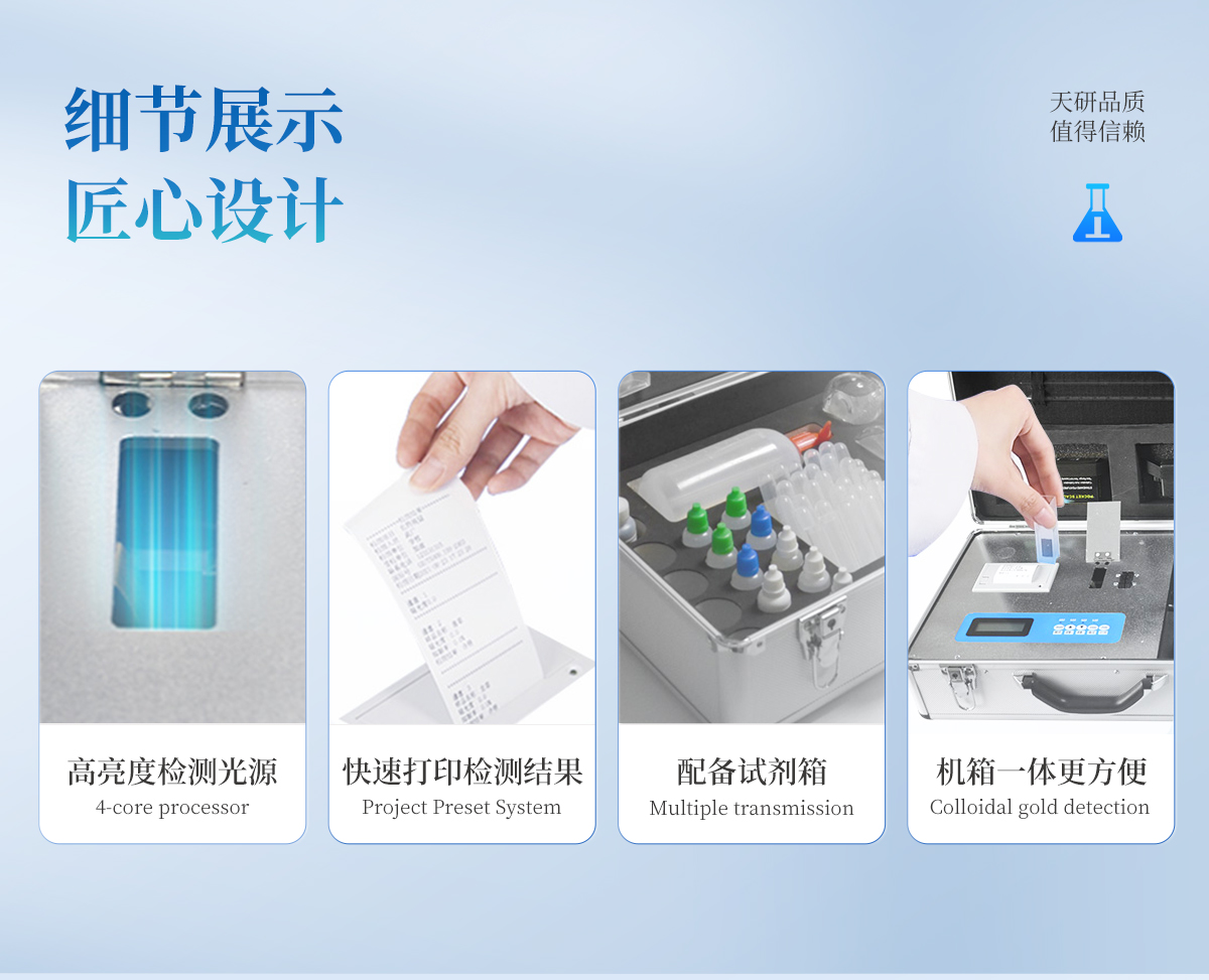 | 《機箱/藥劑一體式鋁合金機箱》專業設計,便于攜帶、堅固耐用,配套成套附件及成品藥劑 | 微電腦控制,數字化線路、程序化設計,液晶顯示,交直流兩用,可野外流動測試。 | 分辨率:0.001,觸摸式按鍵,內置新一代熱敏打印機,可打印測試結果。 | 可檢測化肥、有機肥(含葉面肥、水溶肥、噴施肥等)中的速效氮、速效磷、有效鉀、全氮、全磷、全鉀、有機質、酸堿度,鈣、鎂、硫、鐵、錳、硼、鋅、銅、氯、硅等各種中微量元素以及鉛、鉻、鎘、汞、砷等各種重金屬含量。 | 采用高亮LED燈光源、雙撥輪濾光式處理技術,保證光源波長穩定, 硅半導體作為信號接收系統,壽命長達10萬小時級別。光源穩定,重現性好,準確度高。 | 比色槽部分采用單通道設計,無機械位移及磨損,光路測試定位**,保證測定結果精度。 | 采用高精度濾光片技術,自主分析方法,保證檢測結果優于國標要求。 | 肥料打印結果為百分含量,測試誤差小于0.5%。 |