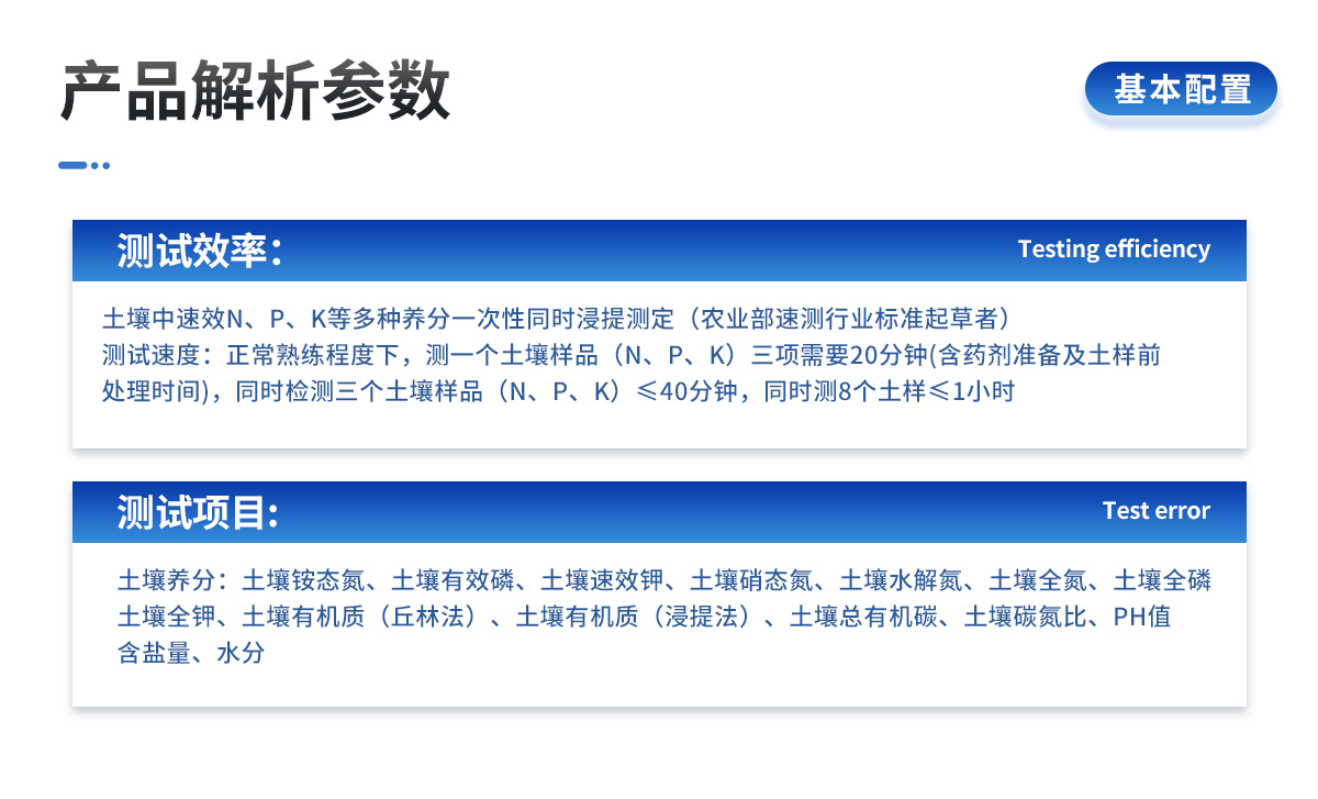 | 土壤中速效N、P、K等多種養分一次性同時浸提測定(農業部速測行業標準起草者)。 | 肥料中氮(N)、磷(P)、鉀(K)等養分同時、快速、準確檢測。 | 測試速度:正常熟練程度下: | 測一個土壤樣品(N、P、K)三項需要20分鐘(含藥劑準備及土樣前處理時間),同時檢測三個土壤樣品(N、P、K)≤40分鐘,同時測8個土樣≤1小時。 | 測試一個肥料樣(N、P、K)≤50分鐘,同時檢測三個肥料樣品(N、P、K)≤1.5小時。 |