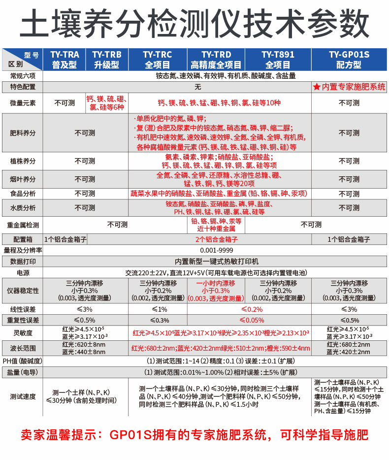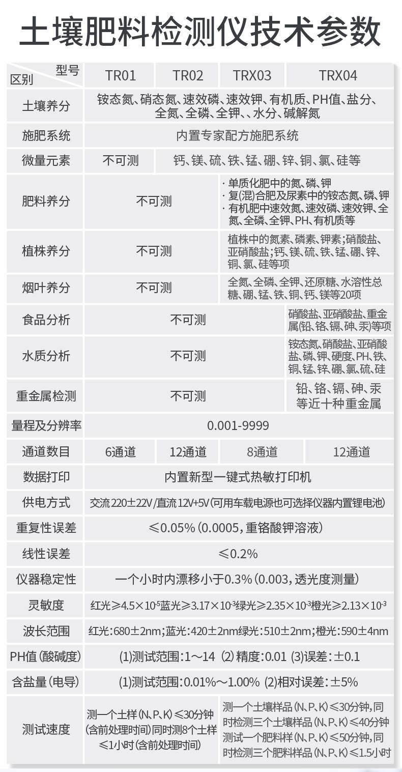 | 儀器測定項目:測定土壤、肥料、食品、蔬菜、水果中重金屬(鉛、砷、鉻、鎘、汞、鐵、鋅、錳、銅)。 | 儀器擴展測試項目:儀器可以擴展測定土壤、肥料養分含量。 |