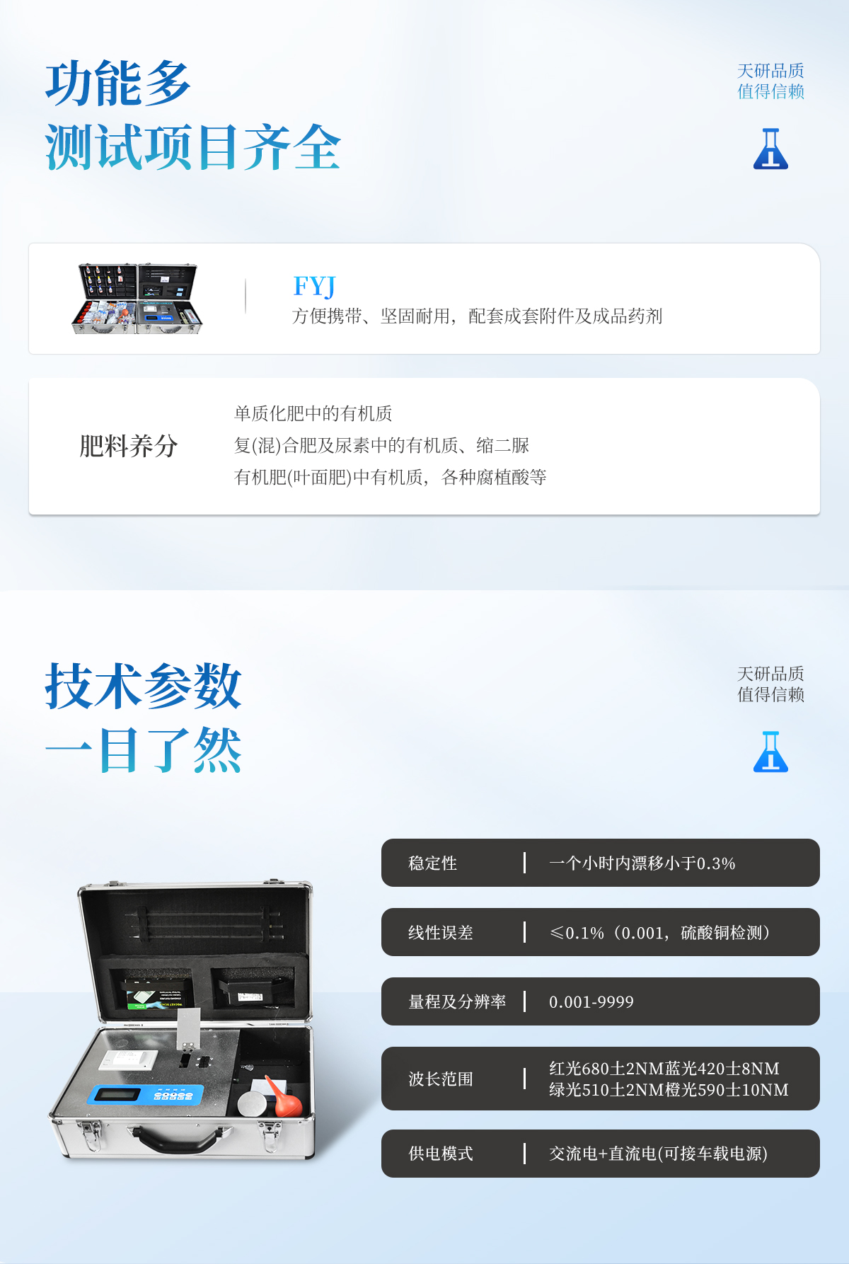 | 肥料養分專用檢測儀功能全:測試項目國內外*全(各類藥劑均可選購)。 | 配套齊全,該儀器集藥、器、儀為一體,攜帶方便,相當于一個小型實驗室,用戶只需提供蒸餾水即可在要求時間內完成全部操作。適于農業服務部門或農資經銷商鑒別肥料真假、肥料廠商肥料生產中控、農資質檢部門進行農資打假,規范農資市場。 | 性能可靠:工作穩定性優于國家標準JJG179-90指標的10倍以上,重復性達到光柵型分光光度計指標水平。 |