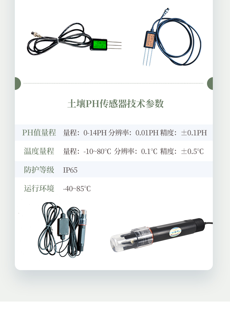 | 測量參數(shù):土壤容積含水量; 單位:%(m3/m3); 測試靈敏度:±0.01 %(m3/m3); | 量程:0-100%(m3/m3) 測量精度:0-50%(m3/m3)范圍內(nèi))±2%(m3/m3); | 50-100%(m3/m3)范圍內(nèi))±3%(m3/m3); 分辨率:0.1% | 土壤溫度范圍:-40-120℃ 測量精度:±0.2℃ 分辨率:±0.1℃ | 土壤鹽分范圍:0-20ms 測量精度:±2% 分辨率:±0.1ms | PH測量范圍:0-14 分辨率:0.1 測量精度:±0.2% | 集成電極:土壤水分,土壤溫度,土壤鹽分三合一,集成到一個傳感器; | ph復合電極:電極為復合電極,自動溫度補償,測試更穩(wěn)定更準確。 | 儀器尺寸:10×21×3.5cm | 供電方式:鋰電池供電、交流電兩種方式 | 軟件:上位機軟件免費贈送 |