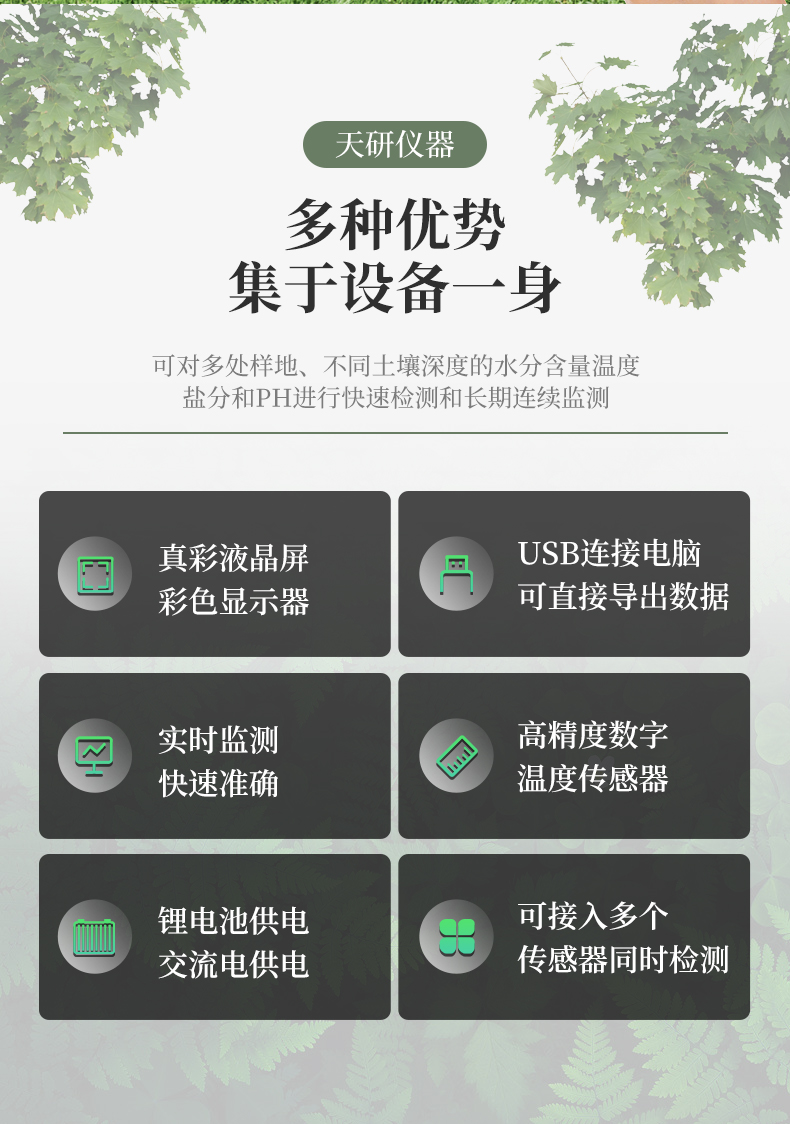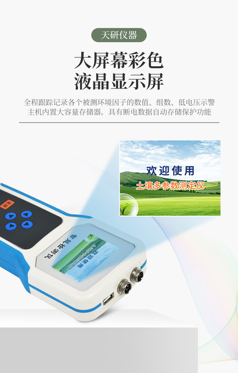| 儀器可加配4G聯網功能和數據管理平臺,將本機存儲的歷史數據無線上傳到智慧云農業平臺,方便用戶進行數據管理和長期分析。 | 可選擇記錄模式:手動記錄、自動記錄,自動記錄可設置記錄時間間隔。 | 采用一體化結構設計,集液晶顯示儀表+傳感器+便攜手提箱合成在一個便攜式手提箱內,本機體積小巧,操作簡單,性能可靠,野外攜帶極為方便。 | 大屏幕中文液晶顯示,可實時顯示溫度值、水分值、組數、低電壓示警,存儲數據等,便于野外攜帶作業。 | 儀表可設置多種土質配方,便于不同土質的水分測量。 | 能存儲指定各個點的土壤溫度值、水分值,上位機軟件功能強大,隨時可以通過USB接口將記錄中的數據導出到計算機上,并可以存儲為EXCE表格文件,生成數據曲線,以供其它分析軟件進一步進行數據處理。 |