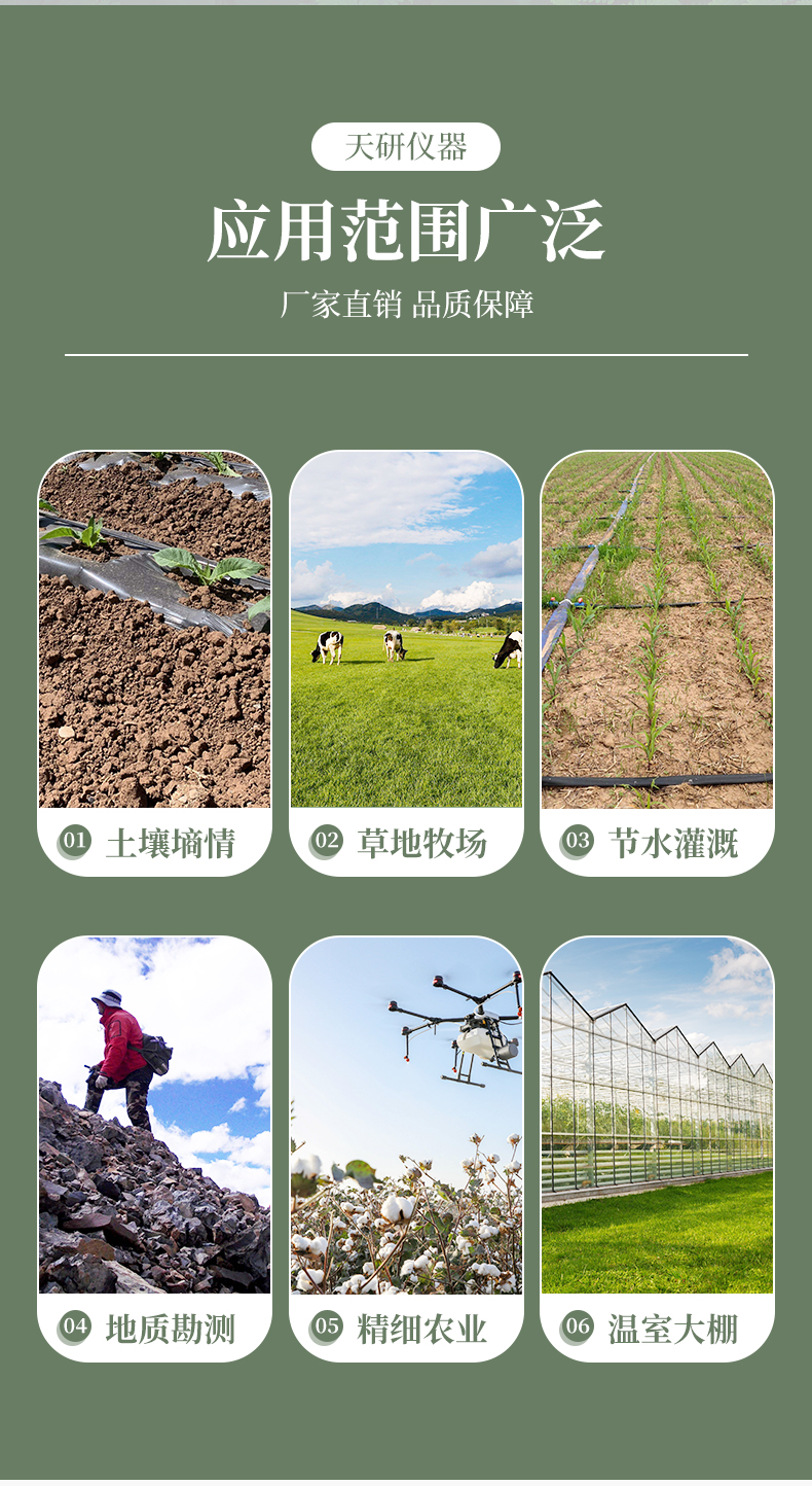 土壤水分測定儀采用FDR頻域反射原理,快速準確測量土壤中含水量,可對多處樣地、不同土壤深度的水分含量進行快速檢測和長期連續監測。廣泛應用于土壤墑情檢測、旱作節水灌溉、精細農業、林業、地質勘探、植物培育等領域。