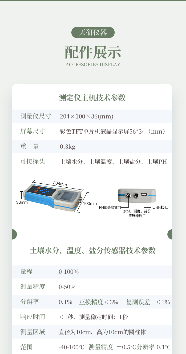 | 測量參數:土壤容積含水量; | 單位:%(m3/m3); | 測試靈敏度:±0.01 %(m3/m3); | 量程:0-100%(m3/m3); | 測量精度:0-50%(m3/m3)范圍內)±2%(m3/m3);50-100%(m3/m3)范圍內)±3%(m3/m3); | 分辨率:0.1% | 測量區域:90%的影響在圍繞中央探針直徑為3cm長為6cm的圓柱體內; | 穩定時間:通電后約10秒鐘; | 響應時間:響應在1秒鐘內進入穩定過程; | 供電方式:鋰電池或交流電 | 通訊方式:USB2.0 | 軟件: 上位機軟件免費贈送 | 線纜: 水分國標屏蔽線2米,溫度聚四氟耐高溫導線2米。 | 測量方式:插入式、埋藏式、剖面等 |