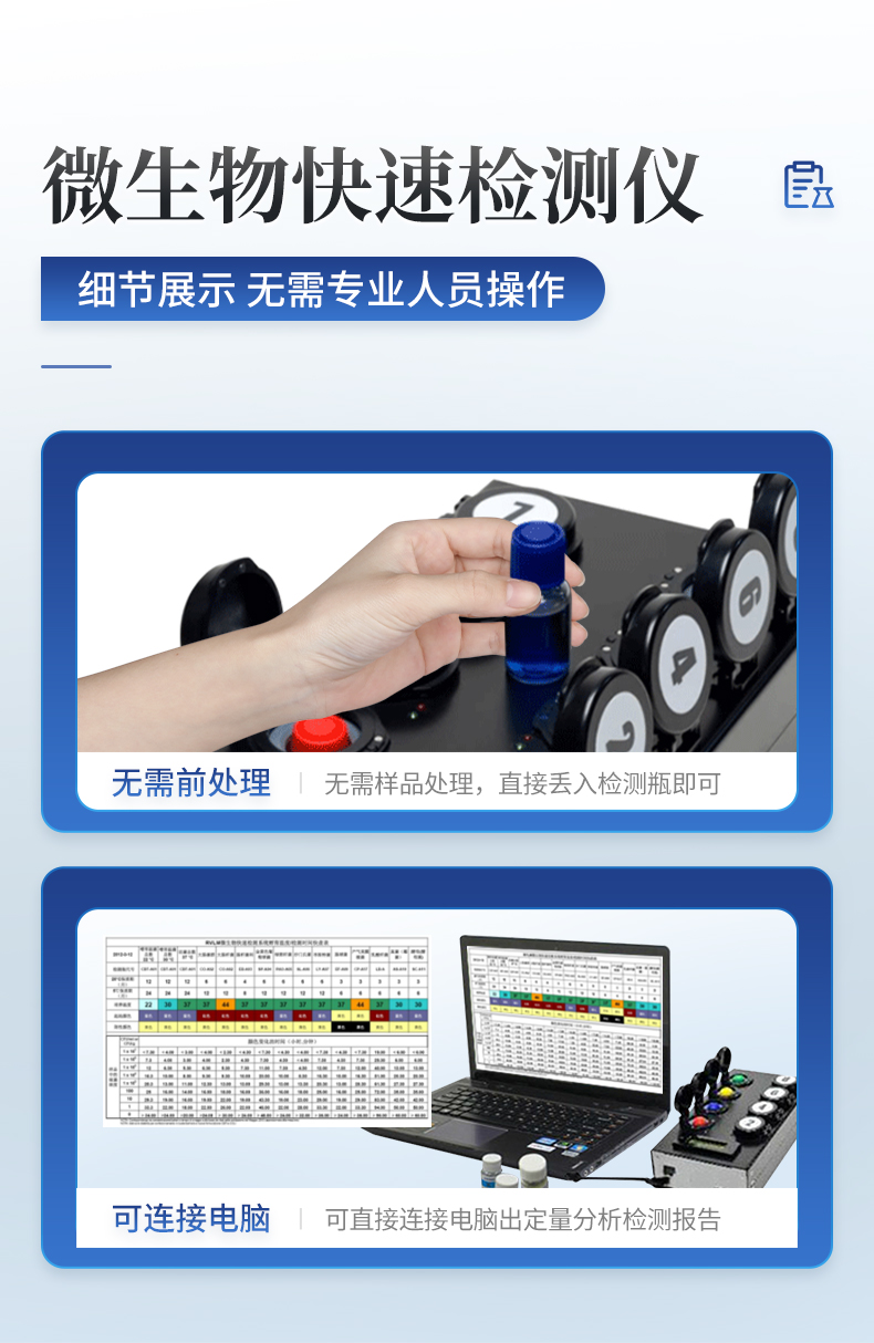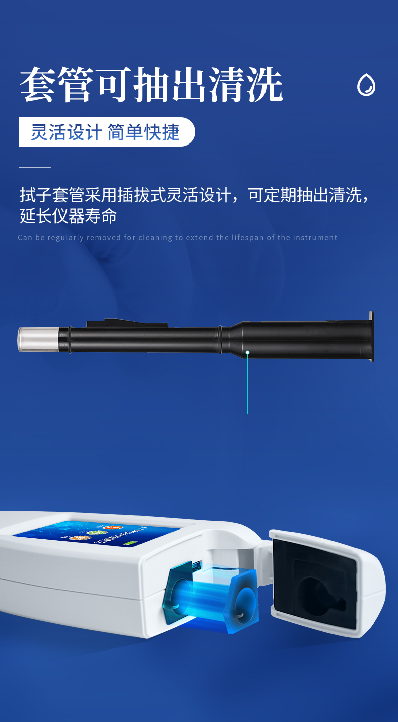 | 實用性 —— 可根據環境檢測需求設定上下限值,做到數據快速評估預警,表面潔凈度快速篩查。 | 靈敏度高 —— *************** | 速度快 —— 常規培養法18-24h以上,而ATP只需要十幾秒鐘 . | 可行性 —— 微生物數量與微生物體內所含ATP有明確的相關性。 通過檢測ATP含量,可間接得出反應中微生物數量 | 可操作性 —— 傳統培養方法需要在實驗室由經過培訓的技術人員進行操作;而ATP快速潔凈度檢測操作非常簡便,只需簡單的培訓即可由一般工作人員進行現場操作。 | 體驗更好 —— 試子套管采用插拔式靈活設計,可定期清洗長期使用,延長儀器壽命。 |