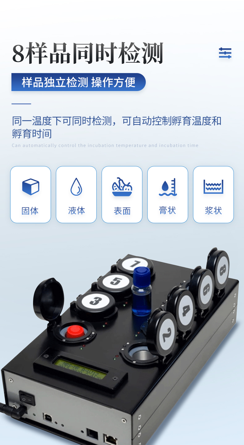 該設備為全新升級產品,大屏幕觸摸顯示屏,代替傳統按鍵。操作采用生物化學反應方法檢測ATP含量,ATP熒光檢測儀基于螢火蟲發光原理,利用“熒光素酶—熒光素體系”快速檢測三磷酸腺苷(ATP)。ATP拭子含有可以裂解細胞膜的試劑,能將細胞內ATP釋放出來,與試劑中含有的特異性酶發生反應,產生光,再用熒光照度計檢測發光值,微生物的數量與發光值成正比,由于所有生物活細胞中含有恒量的ATP,所以ATP含量可以清晰地表明樣品中微生物與其他生物殘余的多少,用于判斷衛生狀況。